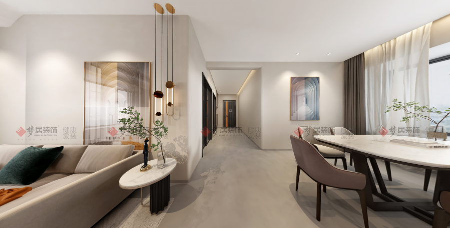 | 設計說明:現(xiàn)代侘寂風格整體給人寧靜、舒適的感覺。這種風格的色調(diào)以亞麻色系為主,從窗簾布藝到沙發(fā)、桌椅的配色都保持高度的統(tǒng)一。每個空間的點睛之筆是燈飾,營造出意境之美,同時注重自然、簡約、舒適,是一種非常宜居的裝修風格,不經(jīng)意間的綠植也是設計師用心的體現(xiàn)??臻g采光好,自由寬敞,墻面奶油調(diào)藝術漆裝飾,搭配淺灰色微水泥地磚、深暖灰紗簾,空間非常協(xié)調(diào)舒適,呈現(xiàn)出自由且隨性的空間氛圍,讓業(yè)主回到家中能夠放空自己,享受寧靜生活。 | |||