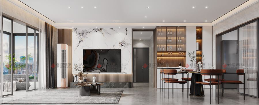 | 設(shè)計(jì)說(shuō)明:本案客廳采用“無(wú)主燈”設(shè)計(jì),整體為現(xiàn)代風(fēng)格設(shè)計(jì)手法,呈現(xiàn)出年輕人所青睞的新時(shí)代舒適居所??蛷d用多種燈光營(yíng)造不同情景的效果,烘托溫馨的氛圍,簡(jiǎn)潔、大氣、舒適?;疑y理地磚,利落的金屬線(xiàn)條,偏硬朗的現(xiàn)代風(fēng)格,優(yōu)雅簡(jiǎn)潔。舒適的布藝沙發(fā)搭配大幅現(xiàn)代簡(jiǎn)約畫(huà)作,極具現(xiàn)代感;電視背景墻做木柵格設(shè)計(jì),時(shí)尚溫馨;吊頂線(xiàn)型軌道燈設(shè)計(jì),現(xiàn)代感滿(mǎn)滿(mǎn)。餐廳設(shè)計(jì)儲(chǔ)納柜,增加儲(chǔ)納空間。臥室采用木地板地面鋪貼更溫馨,簡(jiǎn)約的掛畫(huà)和時(shí)尚的床頭燈做裝飾,空間簡(jiǎn)約舒適。 | |||