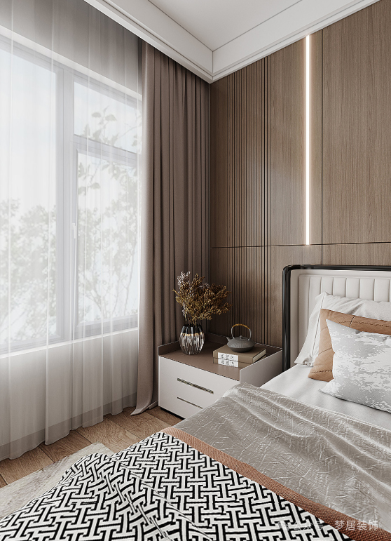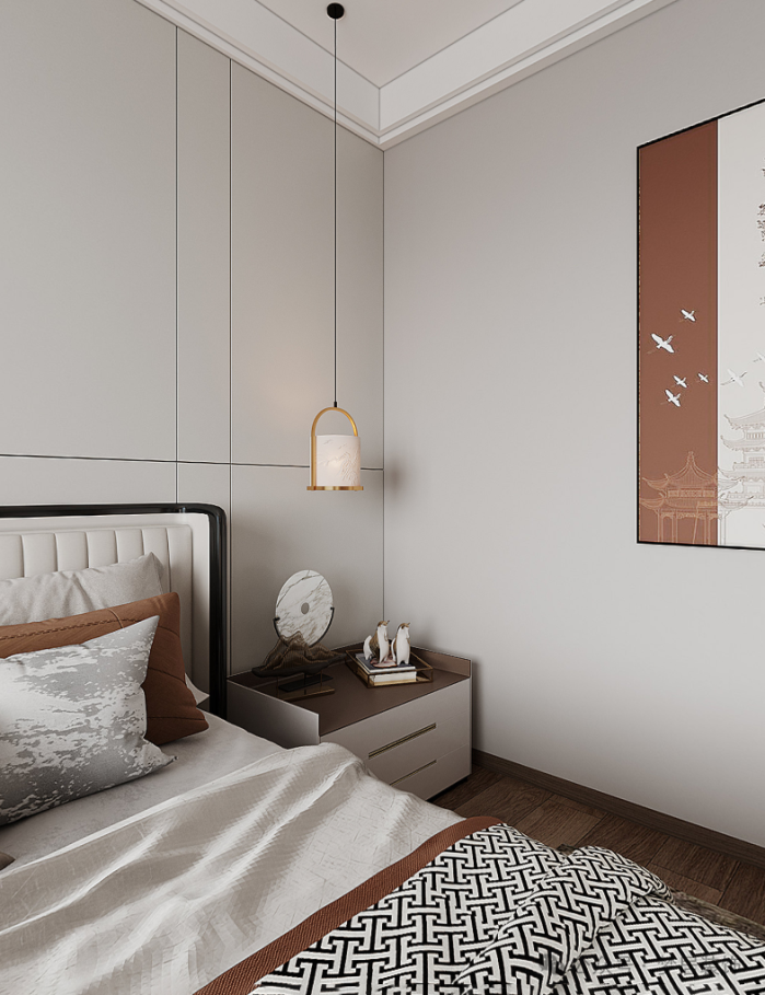 主臥選用淺灰與木色的搭配,整體調(diào)性柔和舒適。軟裝在此基礎(chǔ)上深化,簡約時(shí)尚的黃銅吊燈提升氛圍, 打造更溫馨適宜的休憩空間。