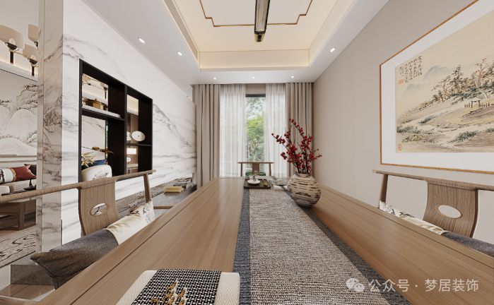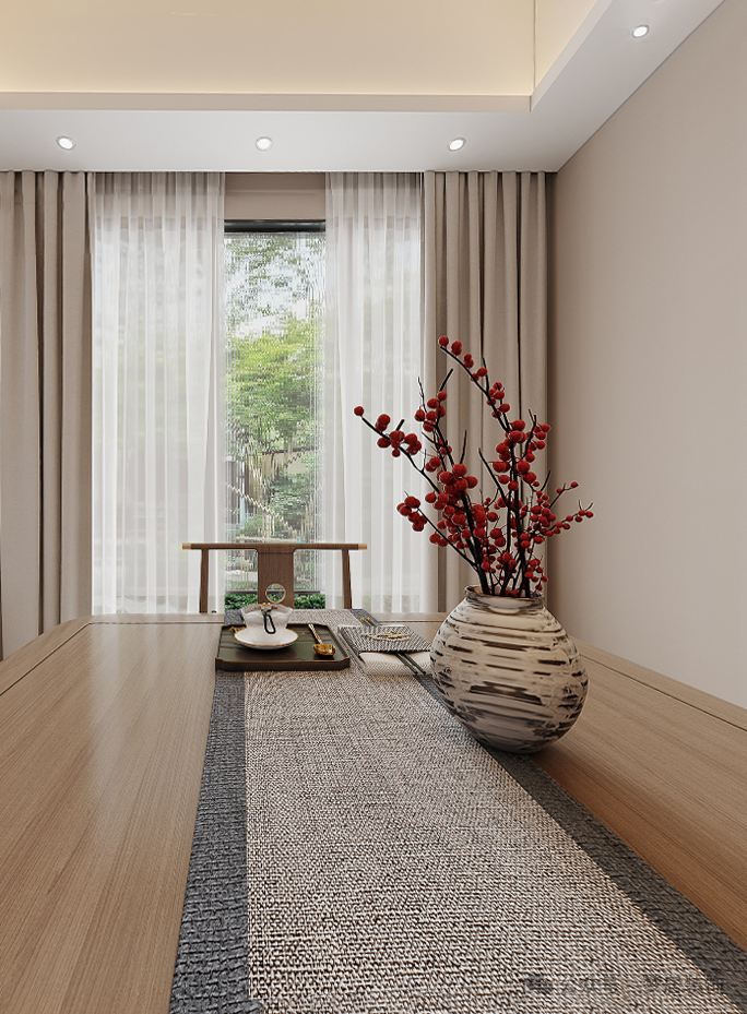 茶室簡約雅靜,中式元素與現(xiàn)代風(fēng)格巧妙融合、碰撞,呈現(xiàn)出濃郁的東方意境??臻g適度的留白,呈現(xiàn)中式風(fēng)格家居的從容與閑適,雅致而靜謐。