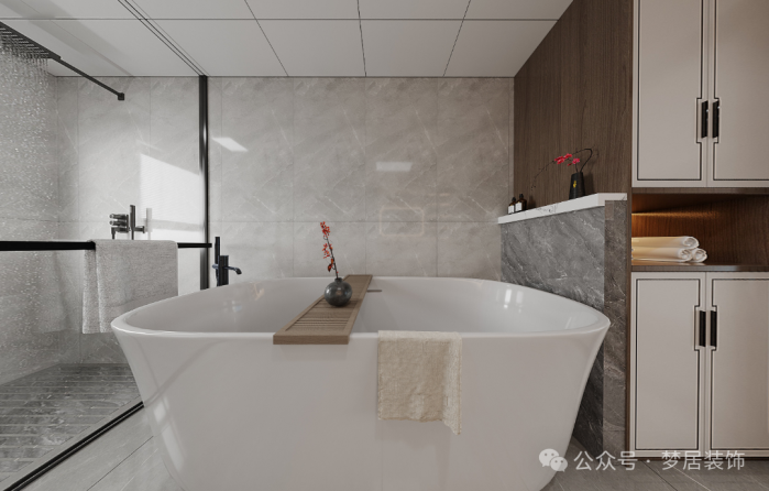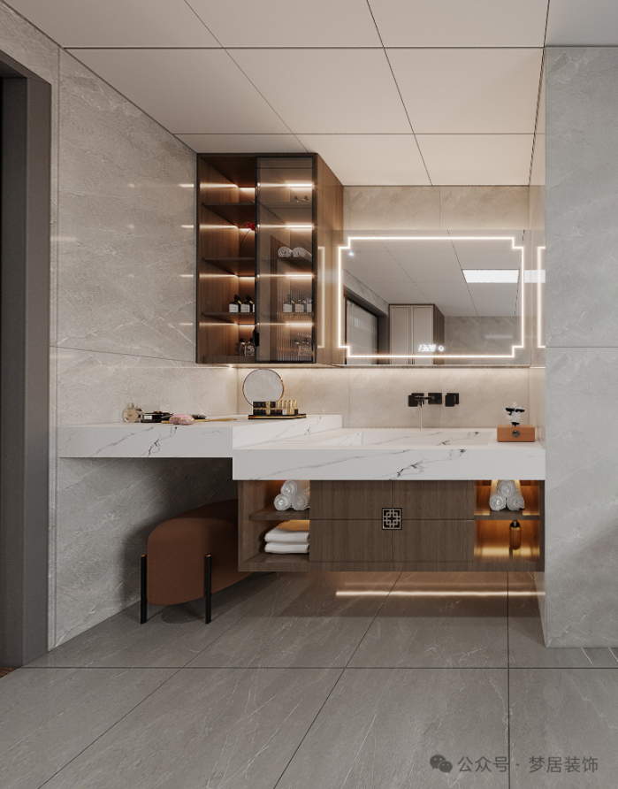 衛(wèi)生間融入中式美學(xué)元素,大理石瓷磚搭配新中式浴室柜帶來輕奢質(zhì)感。柔和的暖色調(diào)與中式元素家具相得益彰,干凈利落的線條呈現(xiàn)傳統(tǒng)與現(xiàn)代融合的新中式家居的獨(dú)特魅力。