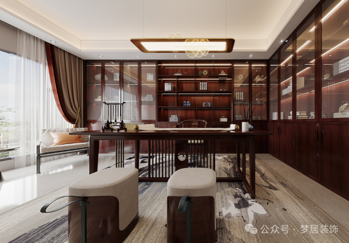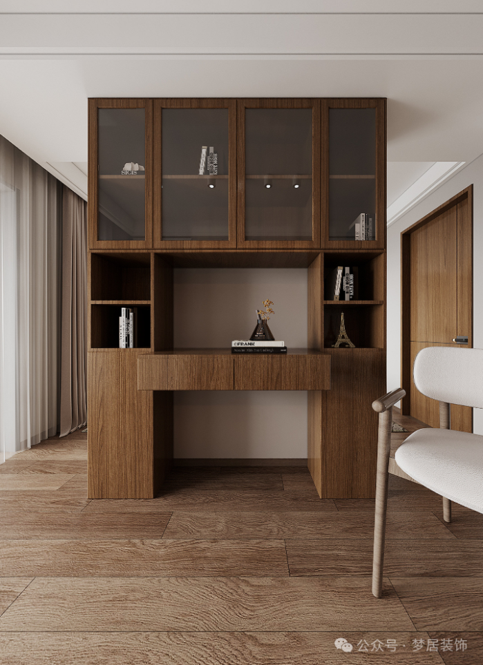 這是一間很有儀式感的書房,新中式實(shí)木書桌椅形制革新承古韻,運(yùn)用墻面做了一排L型的書柜。木質(zhì)帶來的高級、自然質(zhì)感,營造出一種與自然相融、返璞歸真的氛圍,莊重之中更顯層次與高級感。