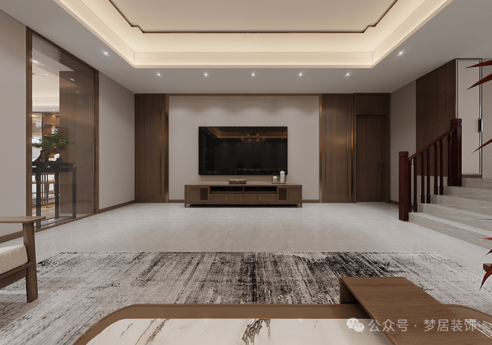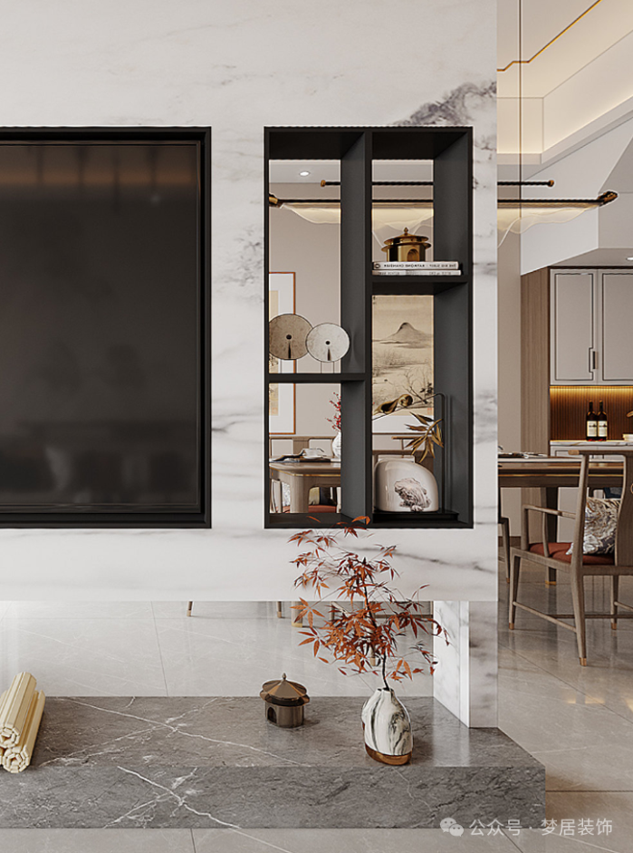 客廳電視背景墻借鑒了中式漏景的設(shè)計(jì)手法來銜接空間與空間的關(guān)系,營造出多樣有趣的視角,空間若隱若現(xiàn),含蓄雅致。