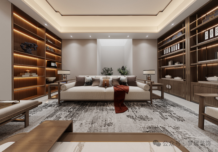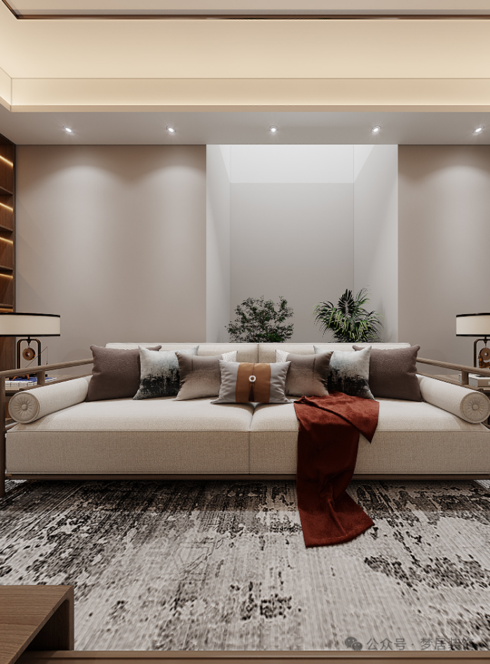 新中式客廳靜謐奢華,米白色調(diào)與原木搭配,即典雅沉穩(wěn)又不厚重,空間成為自然的畫布,呈現(xiàn)新中式家居自有的肌理與溫度。