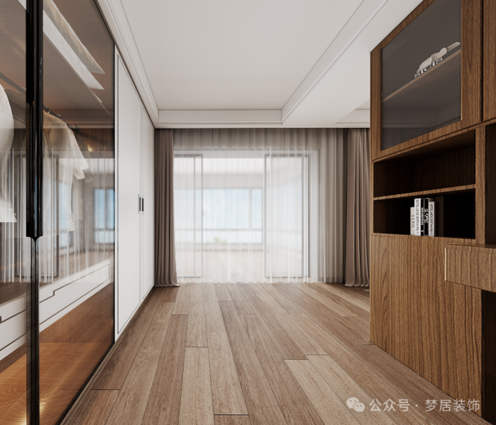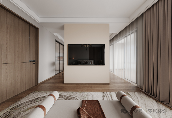 運(yùn)用電視墻面進(jìn)行空間分割,打造半開放式衣帽間,帶來更開闊的視覺觀感,也讓空間舒適通透。