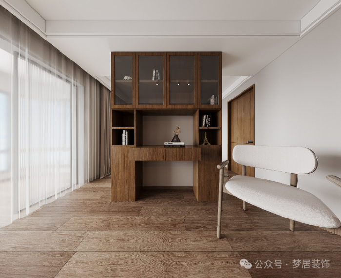 休閑區(qū)增設(shè)到頂?shù)母吖?,可以放置書籍收納藏品。一面玻璃墻讓休閑區(qū)與書房空間更連續(xù),保持空間的通透感,木質(zhì)邊框也讓空間更整體。