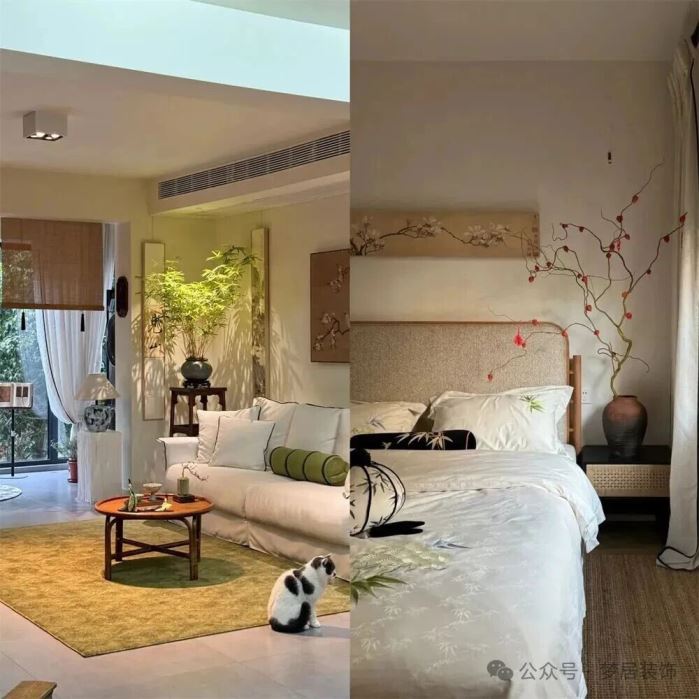 材質(zhì):講究自然肌理和啞光質(zhì)感,多用原木(榆木、白蠟?zāi)荆?、宣紙肌理、素麻、亞光瓷、?xì)密麻布