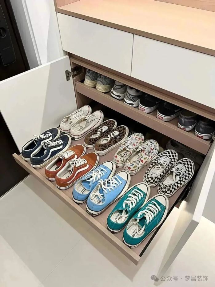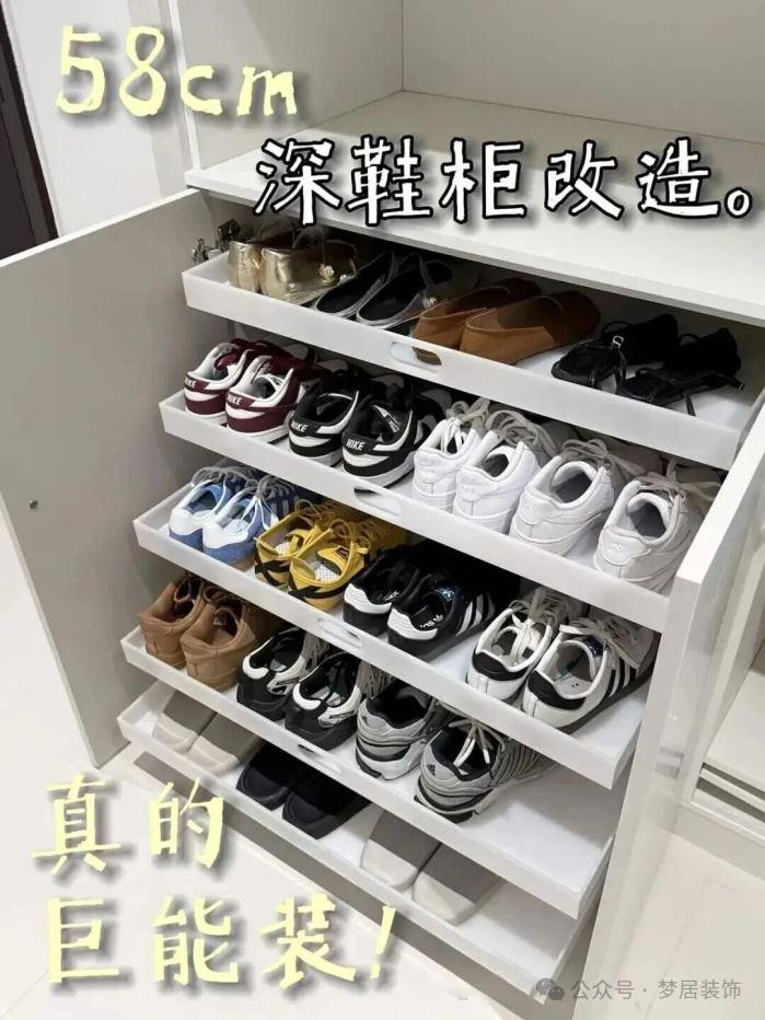 將隔板斜著裝,哪怕深度只有20cm,黃金45°斜插法,鞋子也能穩(wěn)穩(wěn)架在上面,隨手拿,不費勁。