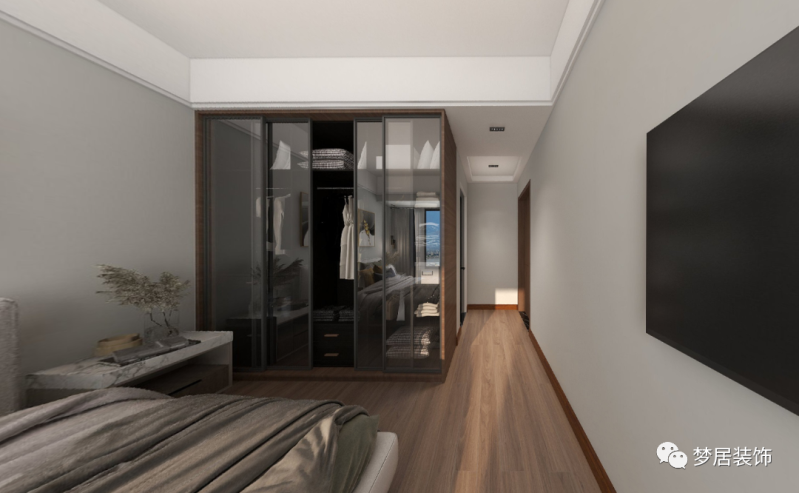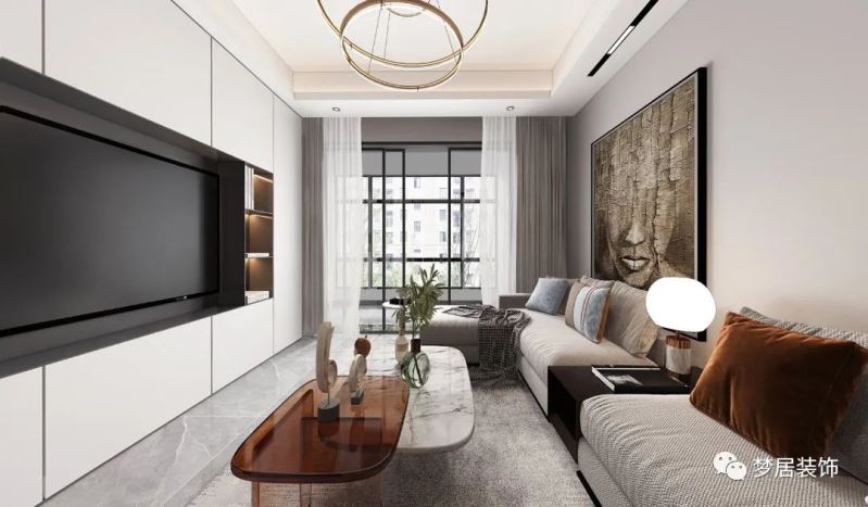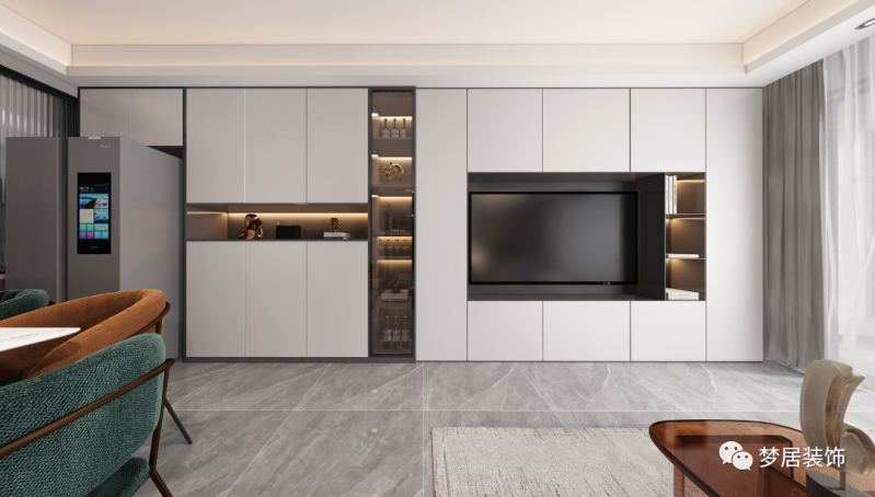 現(xiàn)代簡約設(shè)計(jì)風(fēng)格追求自由,室內(nèi)空間開敞通透。電視背景墻為整排收納柜滿足收納所需,電視內(nèi)嵌讓視覺更整體。使用玻璃、不銹鋼等新型材料作為輔材,給人的感覺前衛(wèi)大氣。
