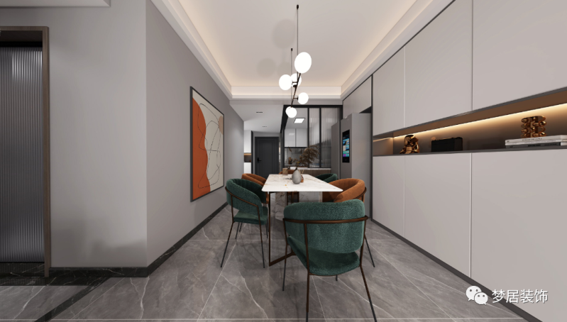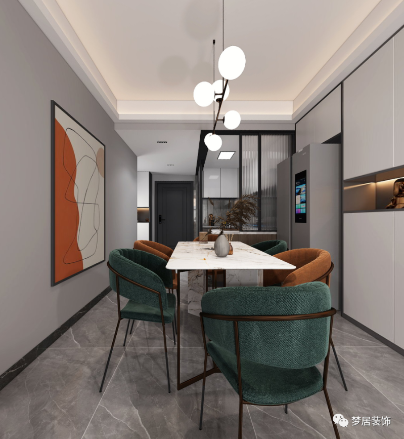極具現(xiàn)代感的造型燈和家具美觀與實(shí)用并存,金屬獨(dú)特的光澤使家具倍感時(shí)尚。高純度色彩掛畫打破空間的平緩,紅橙色的使用大膽而出彩。半開放式廚房使空間更通透明亮。