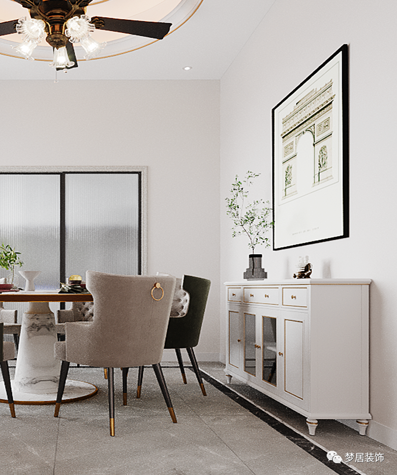 如果餐廳的面積比較小,餐邊柜的體量也就不能做太大了。針對(duì)于小餐廳,我們可以做半高餐邊柜,然后將墻面空白區(qū)域利用起來,比如安裝木板,放置物品,既能收納也很美觀。