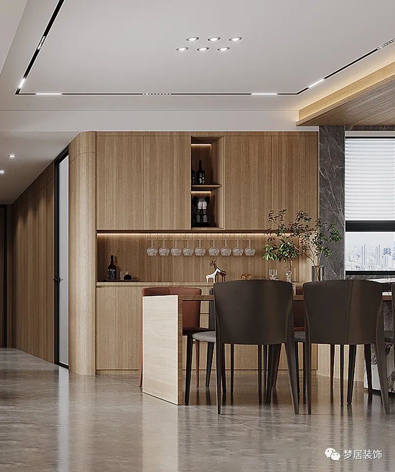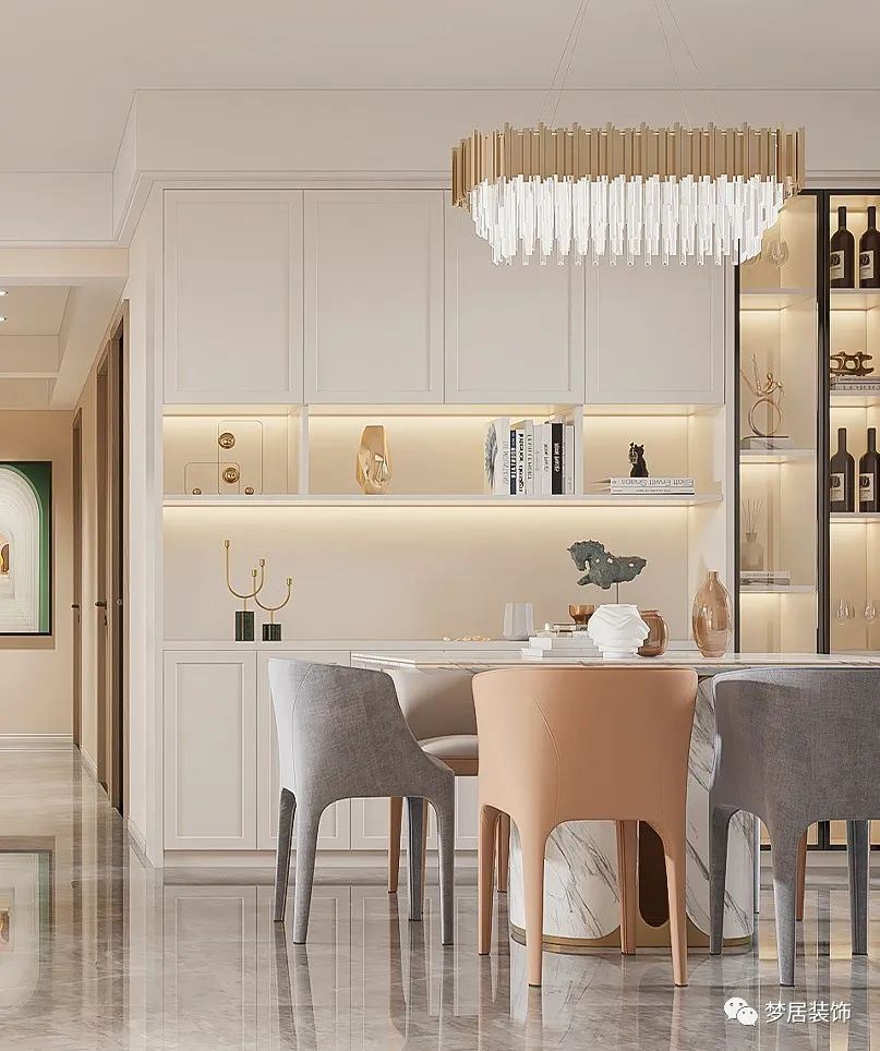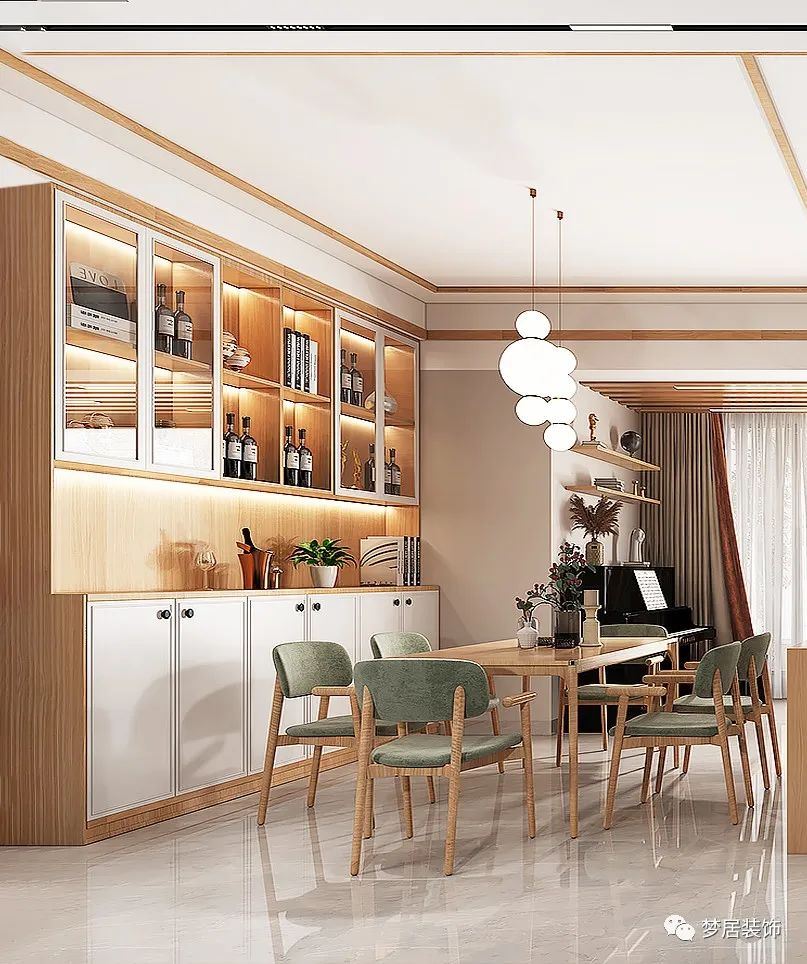 將裝飾品、手辦、喜歡的物件單品放置到展示柜中,裝上燈帶,為餐廳帶來精致氛圍。展示柜可以安裝玻璃柜門,避免落灰問題,減少日常家務(wù)。