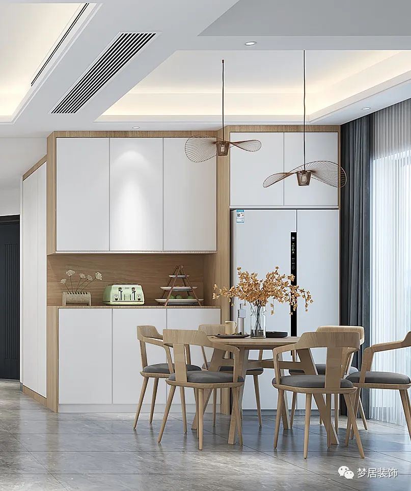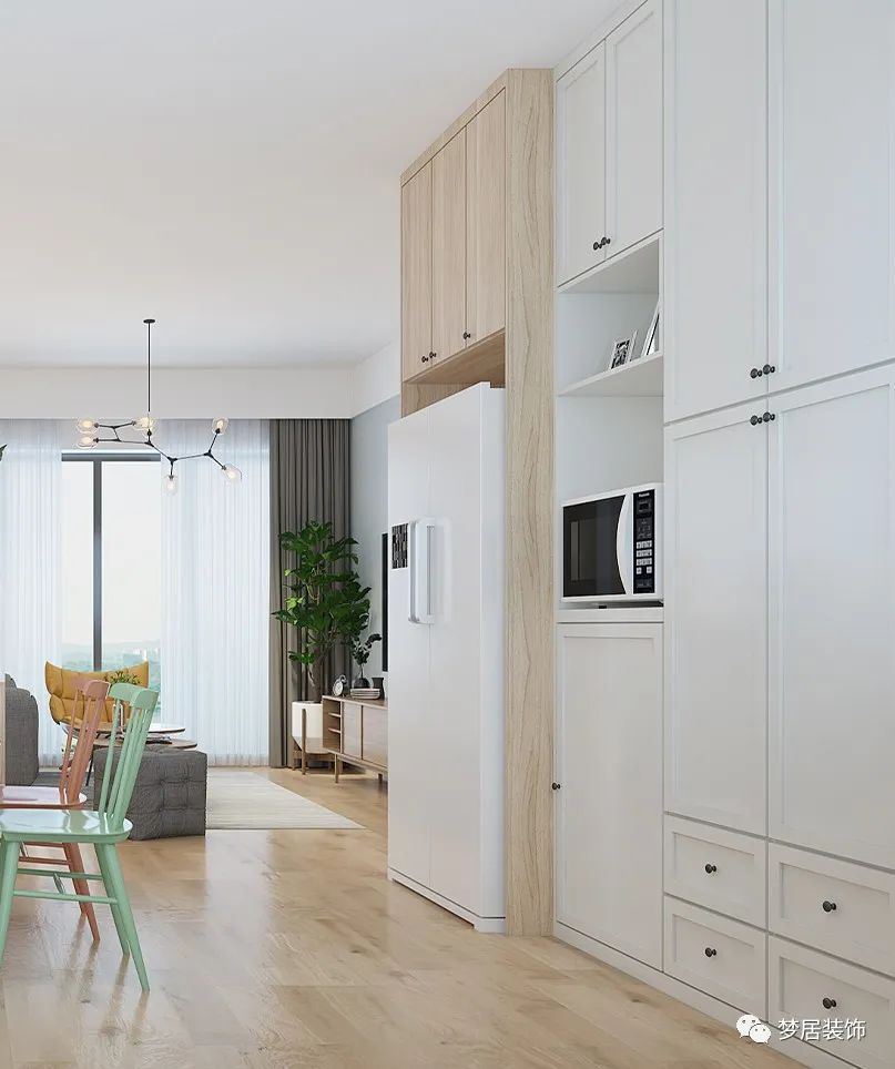 冰箱的厚度比日常的餐邊柜要厚一些,冰箱部分的柜子可以和冰箱做到同一水平面,剩余部分餐邊柜還是保留原有厚度。若追求厚度一致,柜子看起來就會(huì)比較“笨重”。