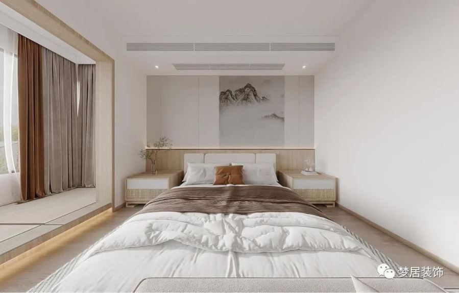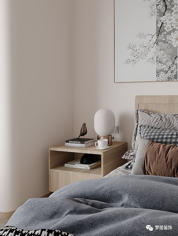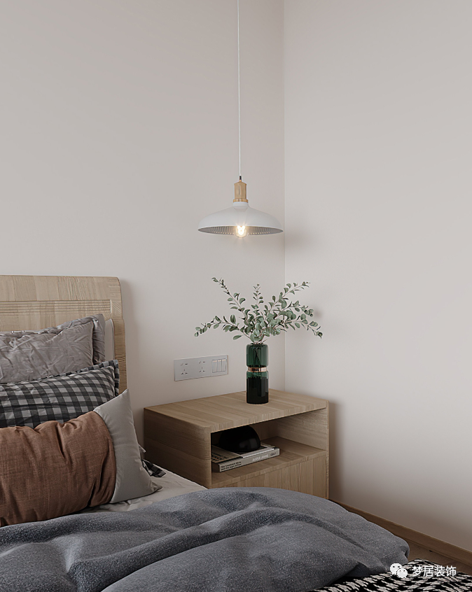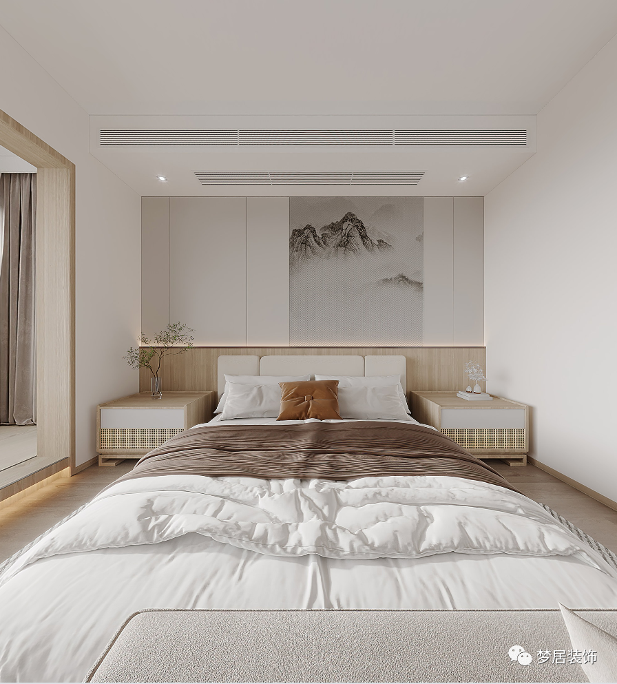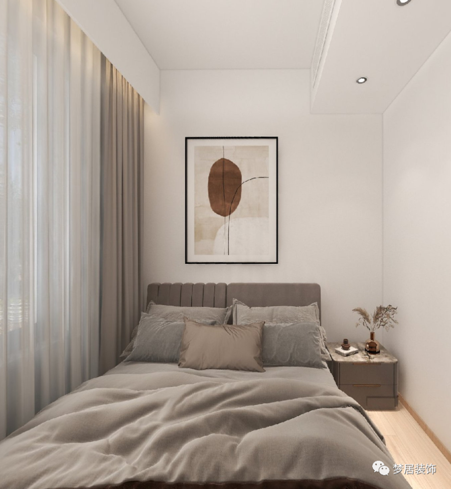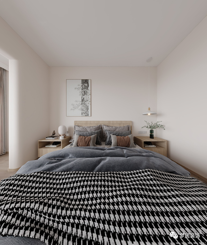 客臥溫馨自然、簡約大方,柔軟的布藝材質(zhì)豐富了整個(gè)空間質(zhì)感,極簡的線型吊燈和掛畫也讓整個(gè)空間增加了趣味。
