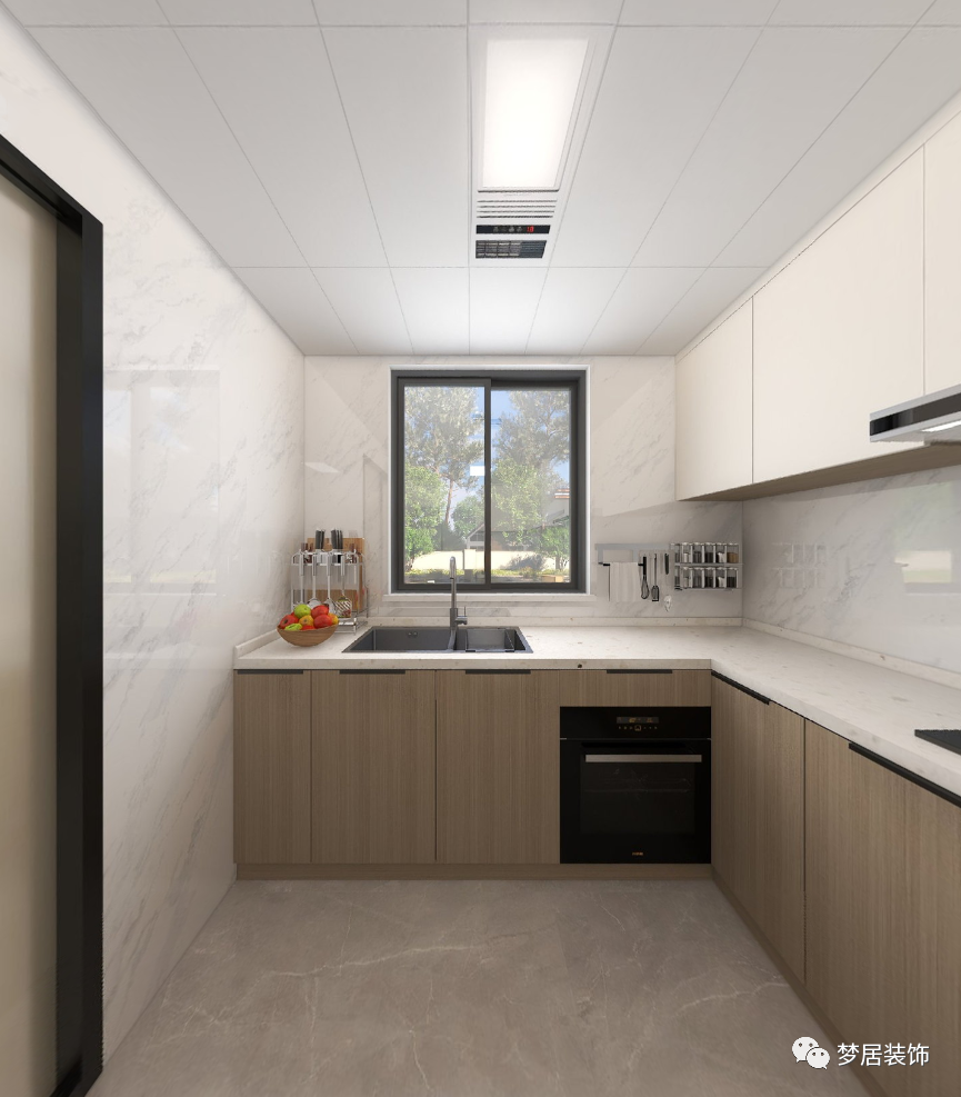 廚房以簡潔的線條分割營造干凈爽朗的空間感,大面積的木色溫潤了空間的的溫度,也提升了空間質(zhì)樸感受。