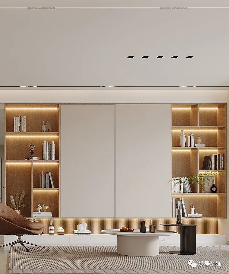 很多人都會給自己定看書計劃,但大多做不到,有了書墻熏陶,看書的頻率也會增加。如果客廳不放電視,書墻是很不錯的選擇。讓電視墻變成書墻和收納柜,把書房和客廳的概念進行結(jié)合。