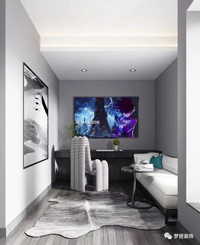 擁有一個獨立的影音室、電競房應該是不少人的夢想吧,氛圍也是營造中的重點。合理的燈光分布可以幫助營造氛圍,有明有暗,烘托氣氛,無主燈照明可以選擇帶智能調(diào)光的筒燈或者吸頂燈,可以隨時調(diào)節(jié)明暗度。