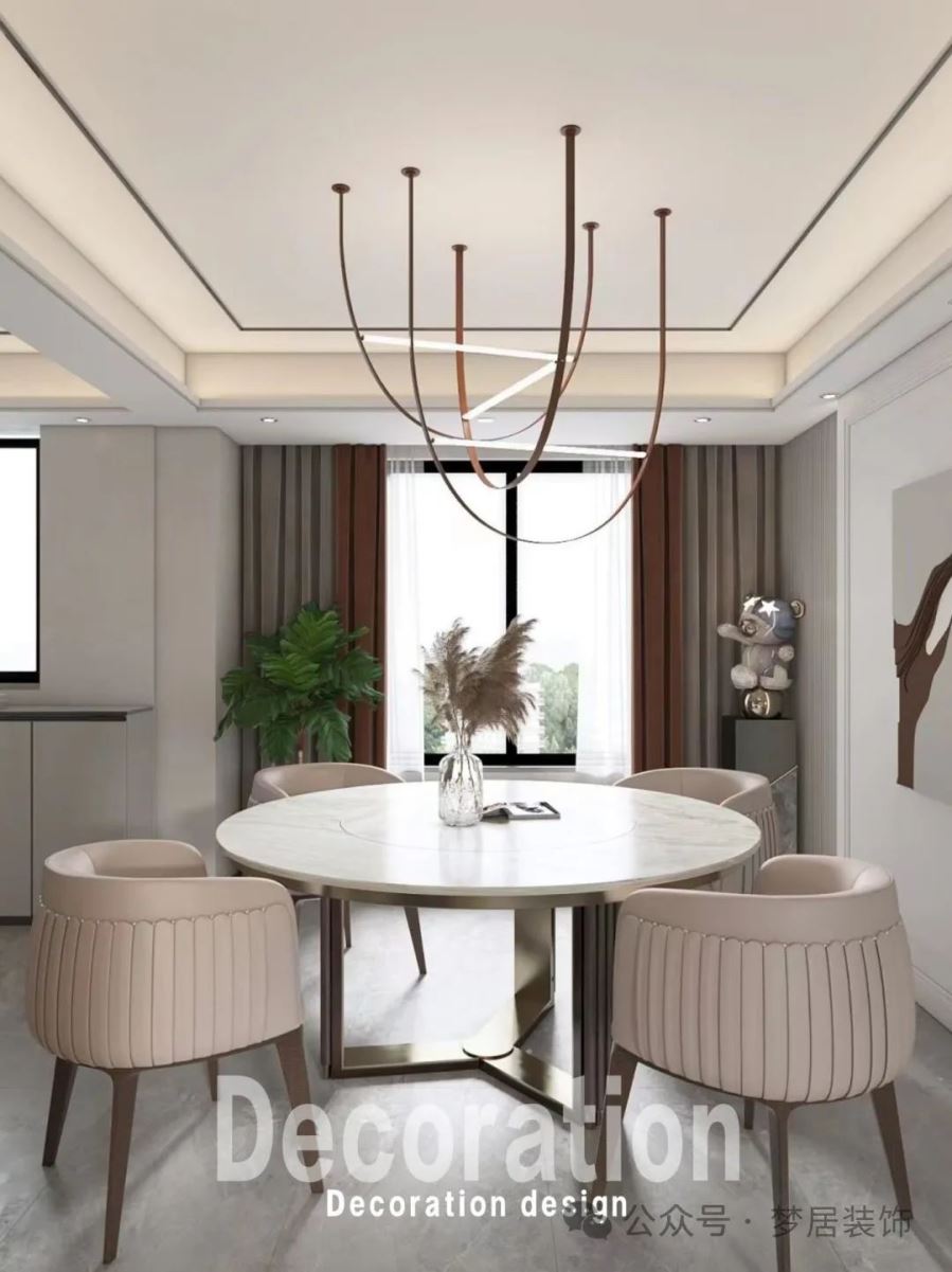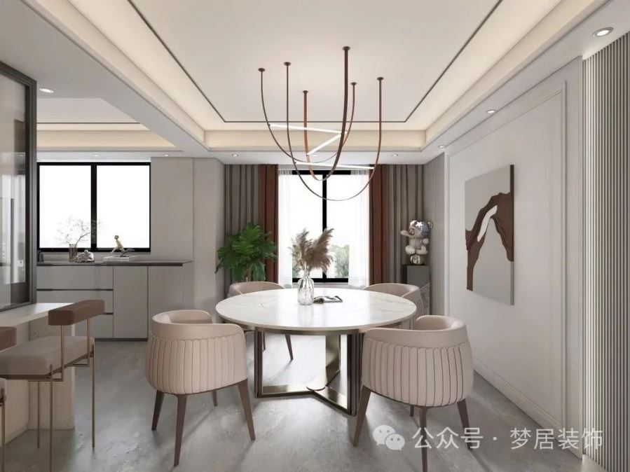 時(shí)尚的燈飾裝飾著餐廳,造型線條精致輕奢;圓形的餐桌搭配白色的座椅,簡(jiǎn)約又優(yōu)雅。餐廳背景墻上的簡(jiǎn)約裝飾畫(huà),更顯得時(shí)尚個(gè)性;左面做了一個(gè)小吧臺(tái)。