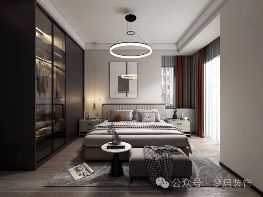 主臥裝修以灰色為基調(diào),搭配木地板,溫馨又有質(zhì)感。灰色系搭配簡(jiǎn)約而又高級(jí)優(yōu)雅,大落地窗采光舒適,簡(jiǎn)約又自在。