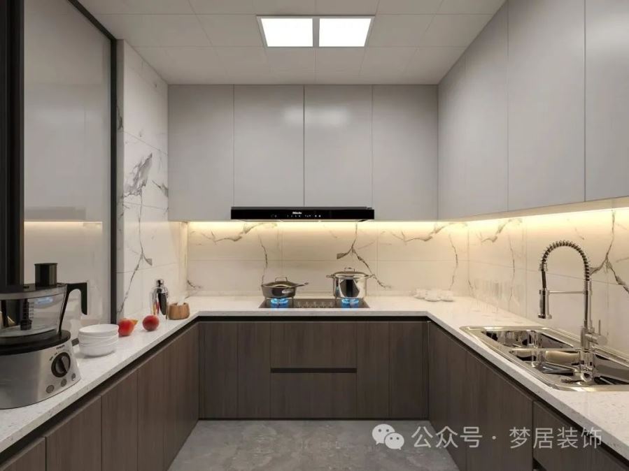 U型廚房布局簡(jiǎn)約、實(shí)用、美觀,干凈的色彩搭配讓整個(gè)空間更簡(jiǎn)約大氣。上下櫥柜做了顏色區(qū)分,烤漆面板防水耐磨也更易清潔,減輕日常家務(wù)。幾組櫥柜滿足收納功能,空間更加實(shí)用。