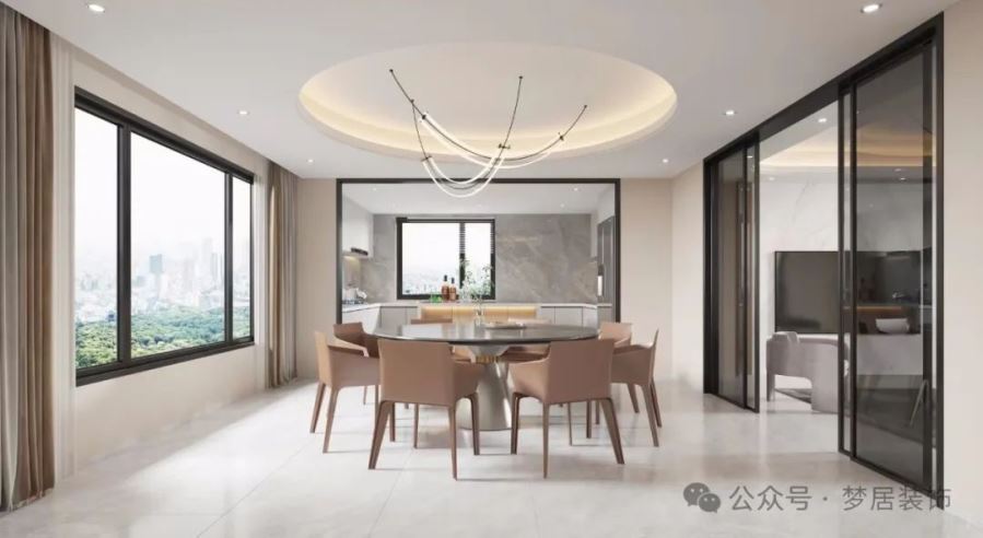 餐廳舒適、優(yōu)雅。圓形天花吊頂造型設(shè)計、現(xiàn)代時尚造型主燈、駝色餐椅、黑色玻璃推拉門的使用增強空間的層次和立體時尚感。
