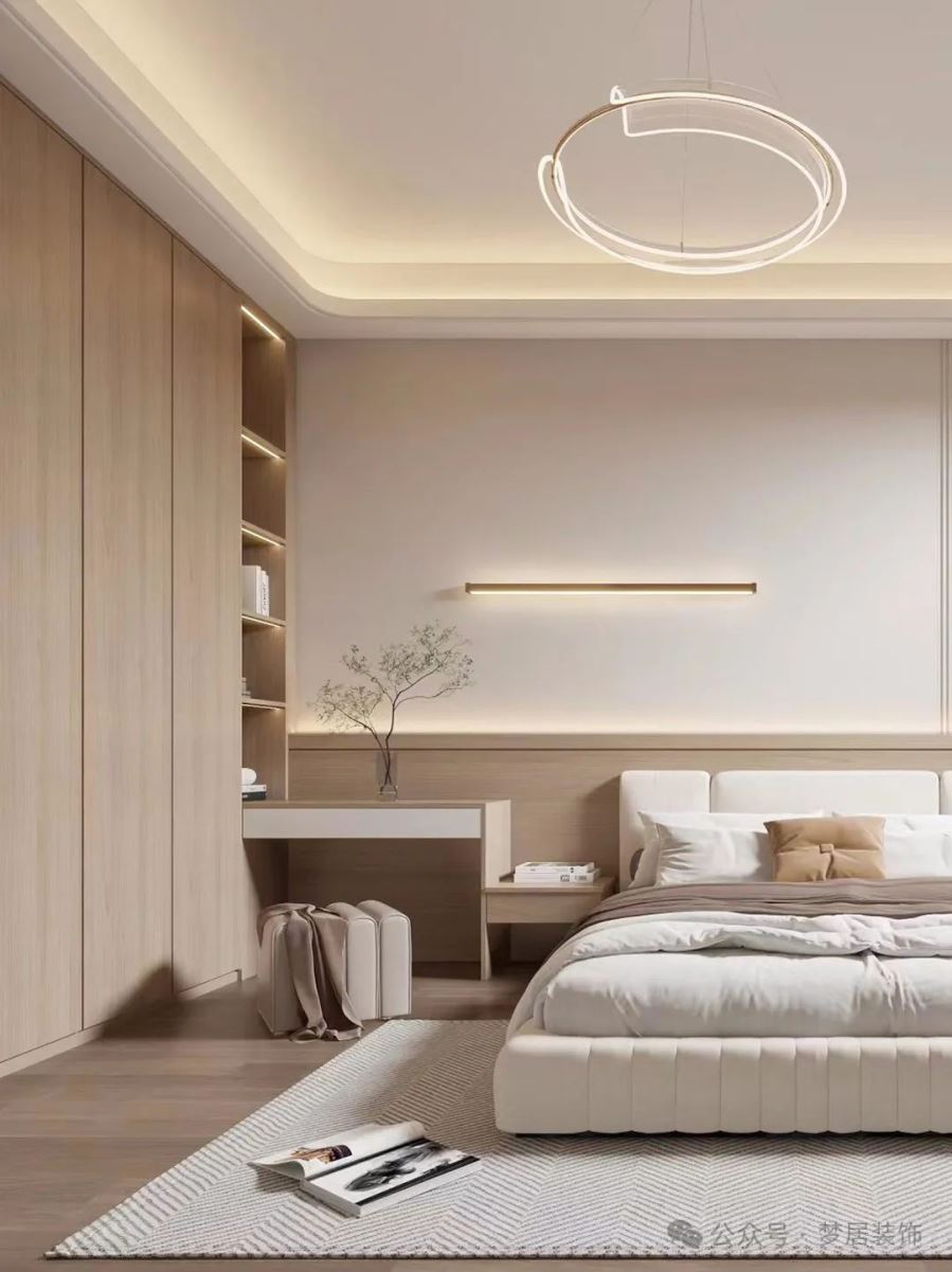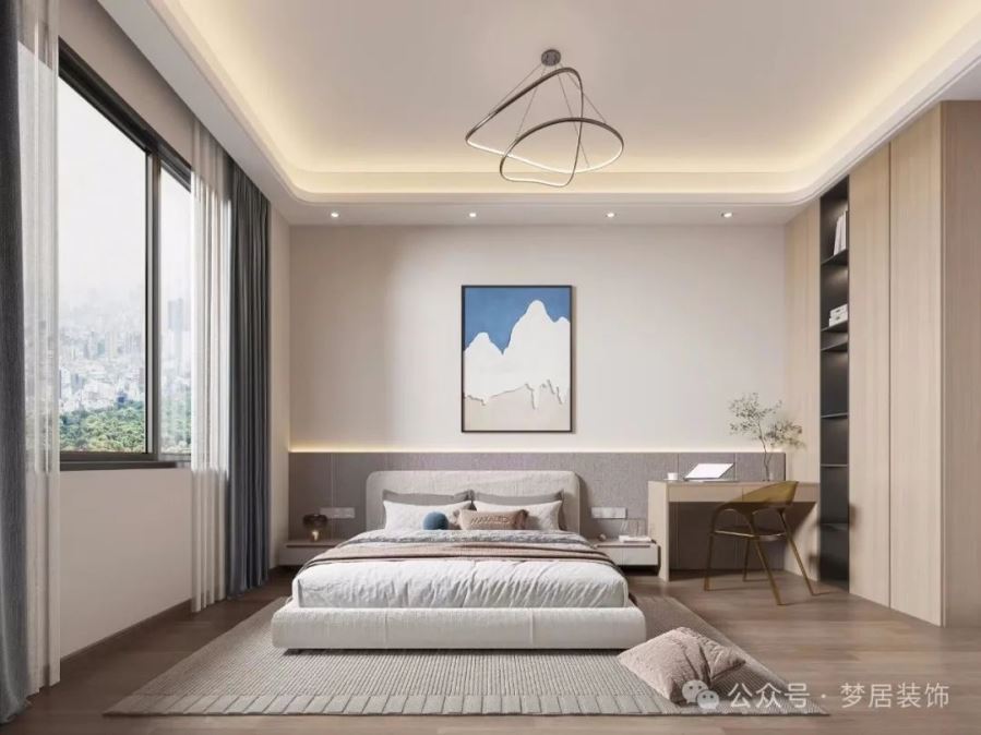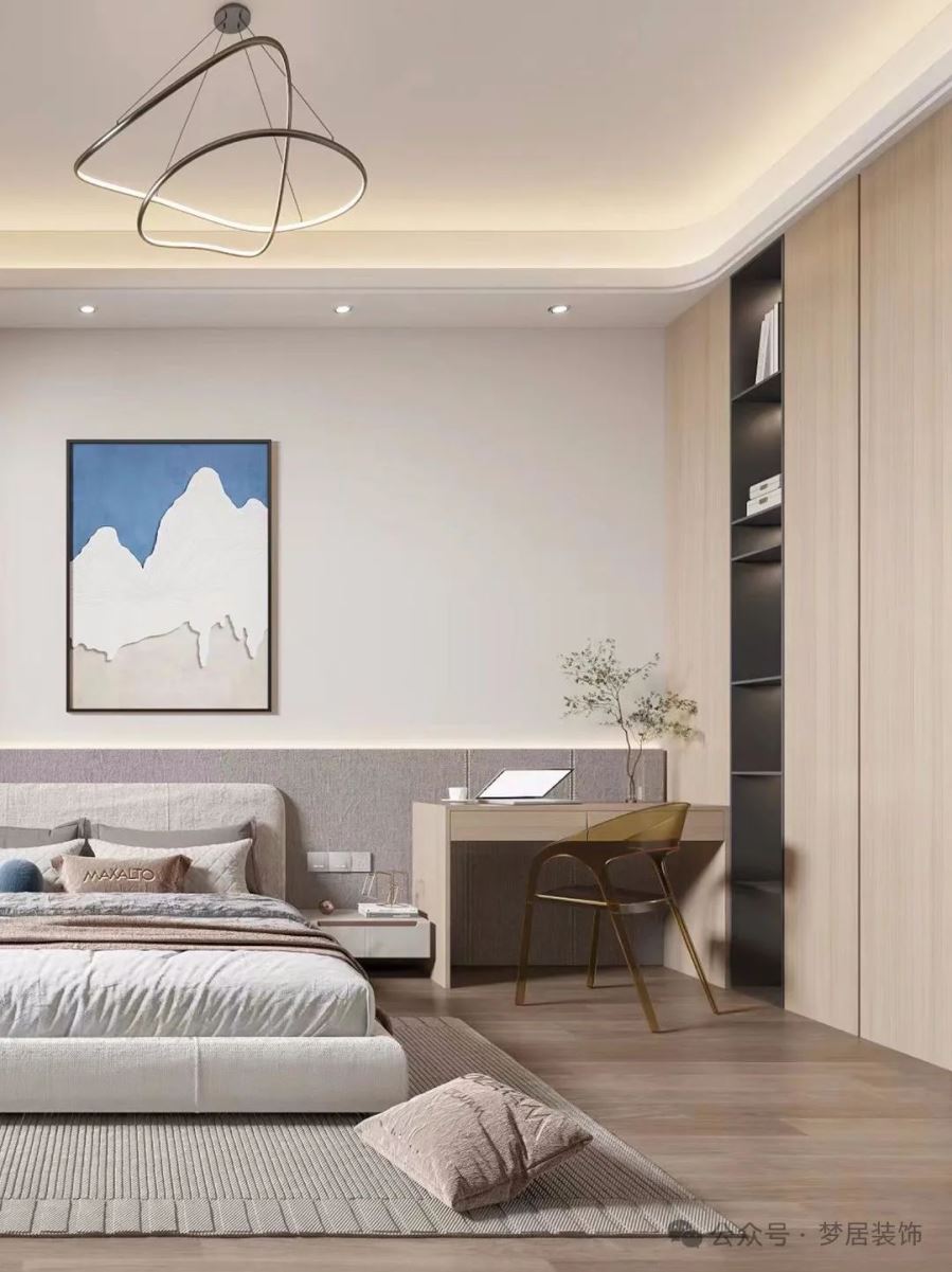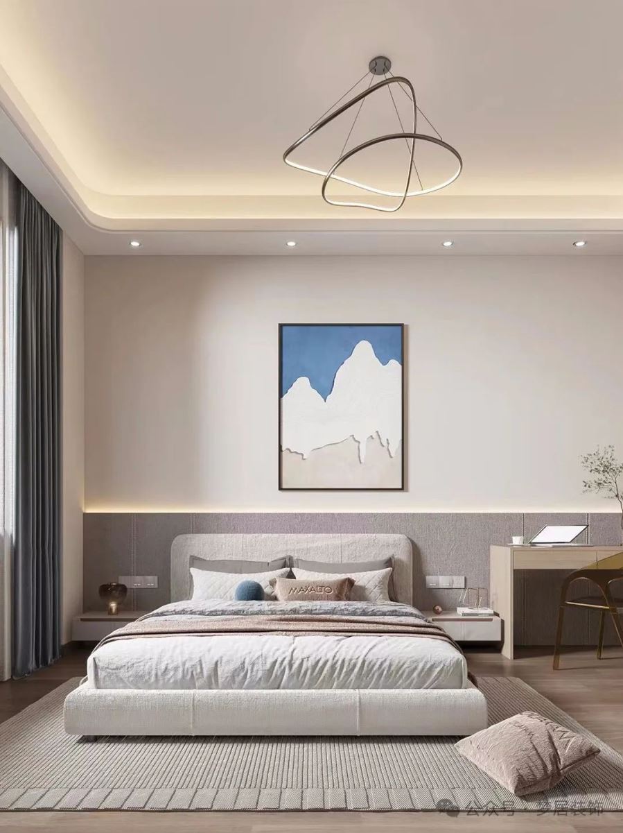 主臥設(shè)計舒適又充滿現(xiàn)代感。以柔和的暖色調(diào)為主,營造溫馨舒適的氛圍。家具選擇簡約、線條流暢的家具,注重實用性和舒適性。智能化照明,提升居住的便捷性和舒適度。