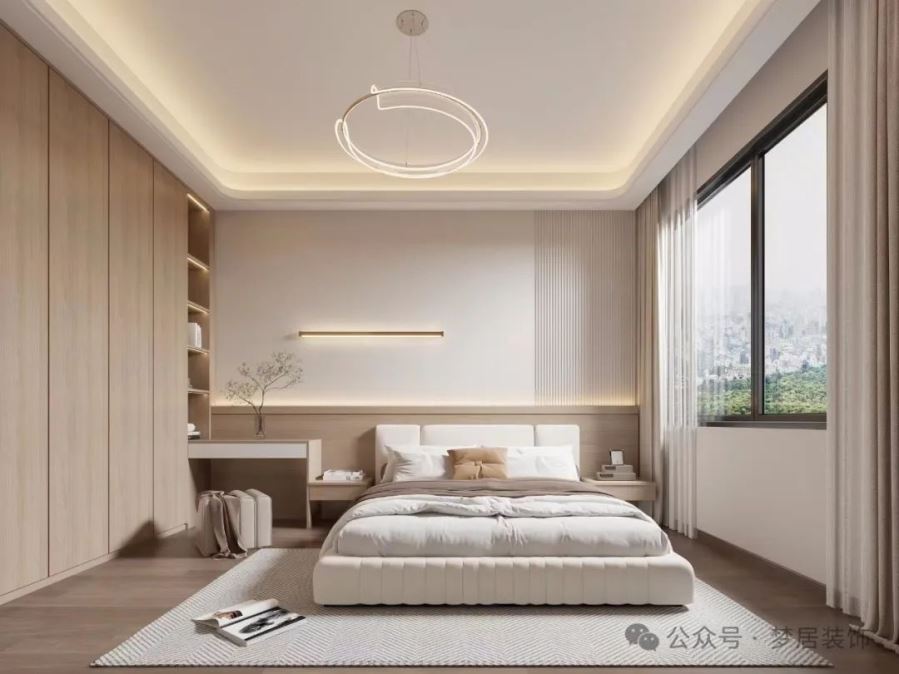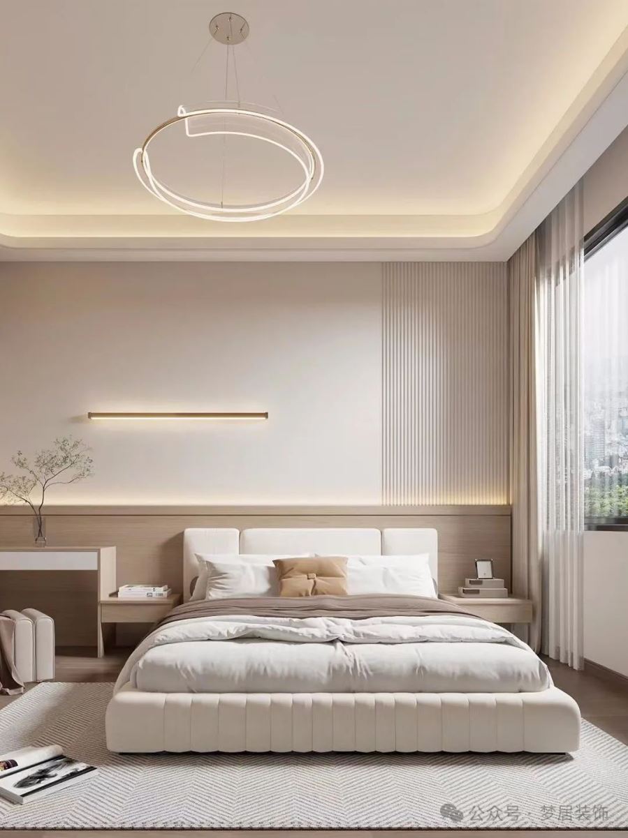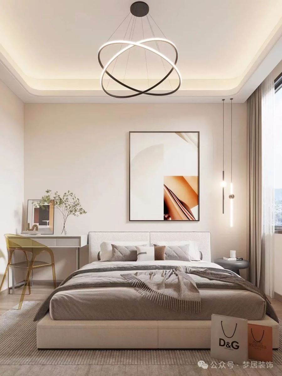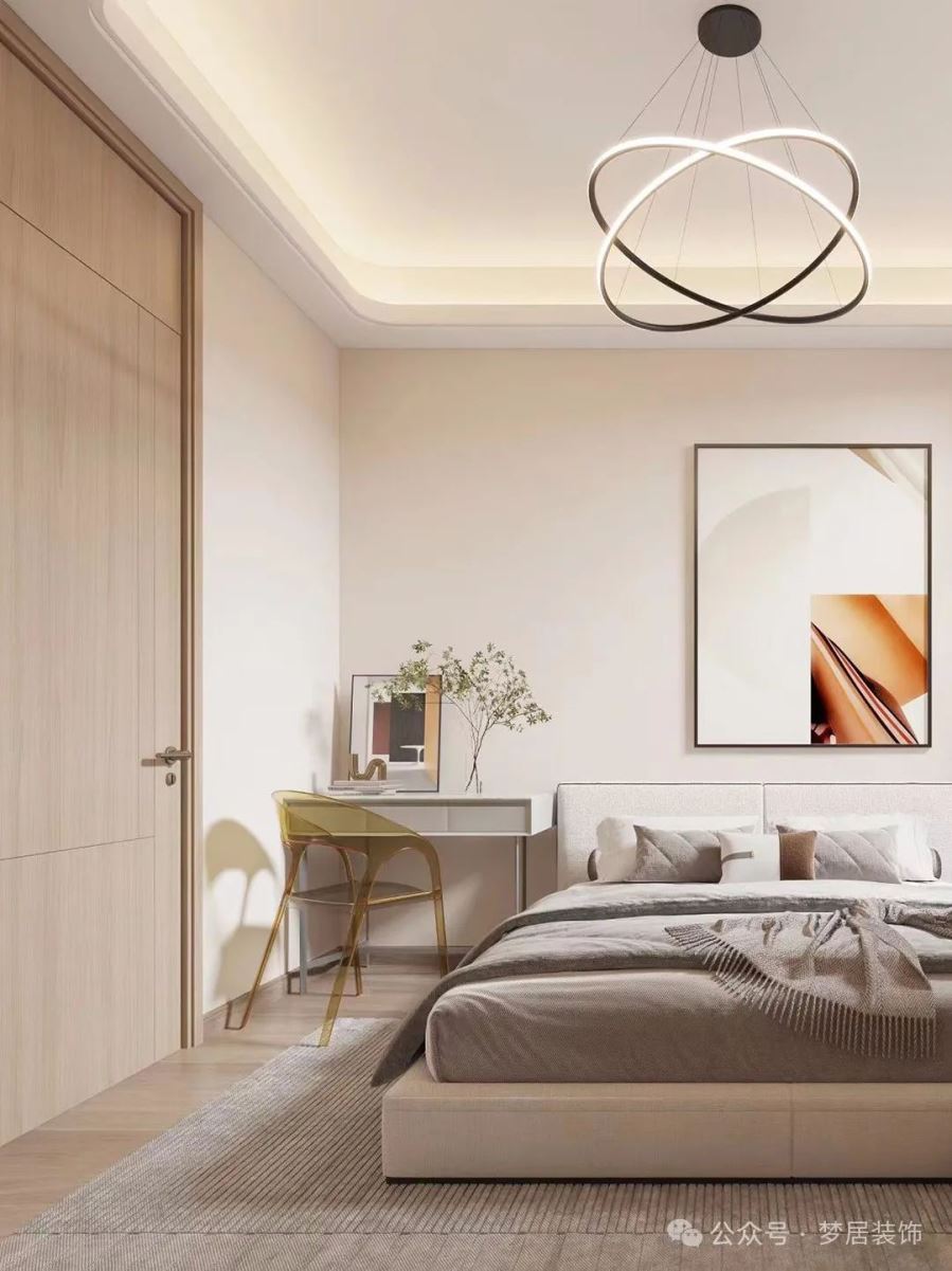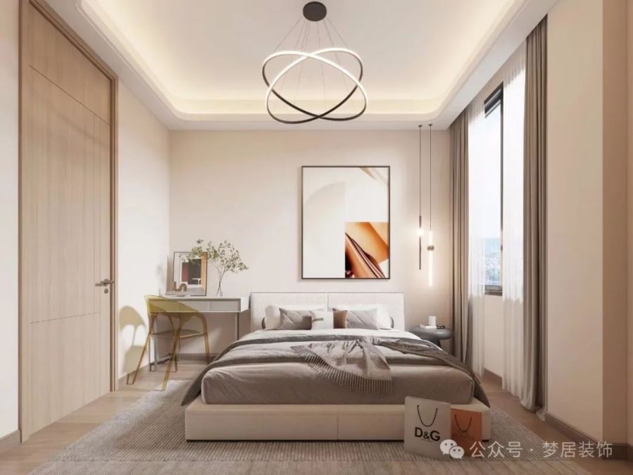 主臥設(shè)計舒適又充滿現(xiàn)代感。以柔和的暖色調(diào)為主,營造溫馨舒適的氛圍。家具選擇簡約、線條流暢的家具,注重實用性和舒適性。智能化照明,提升居住的便捷性和舒適度。