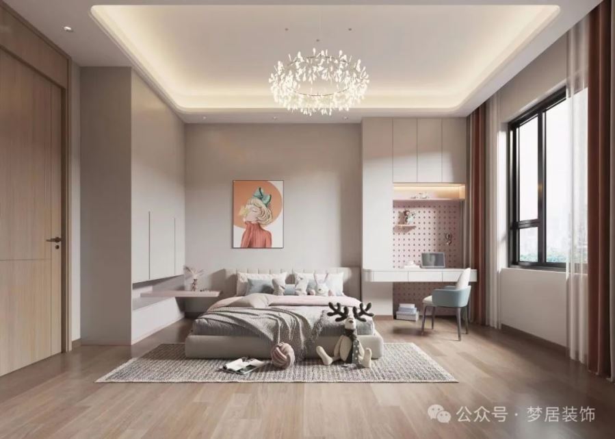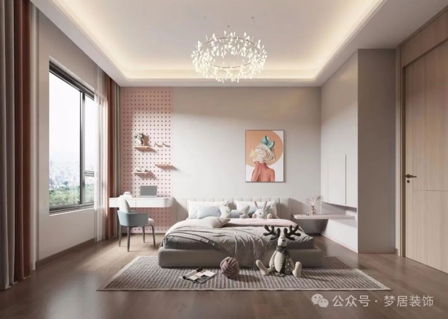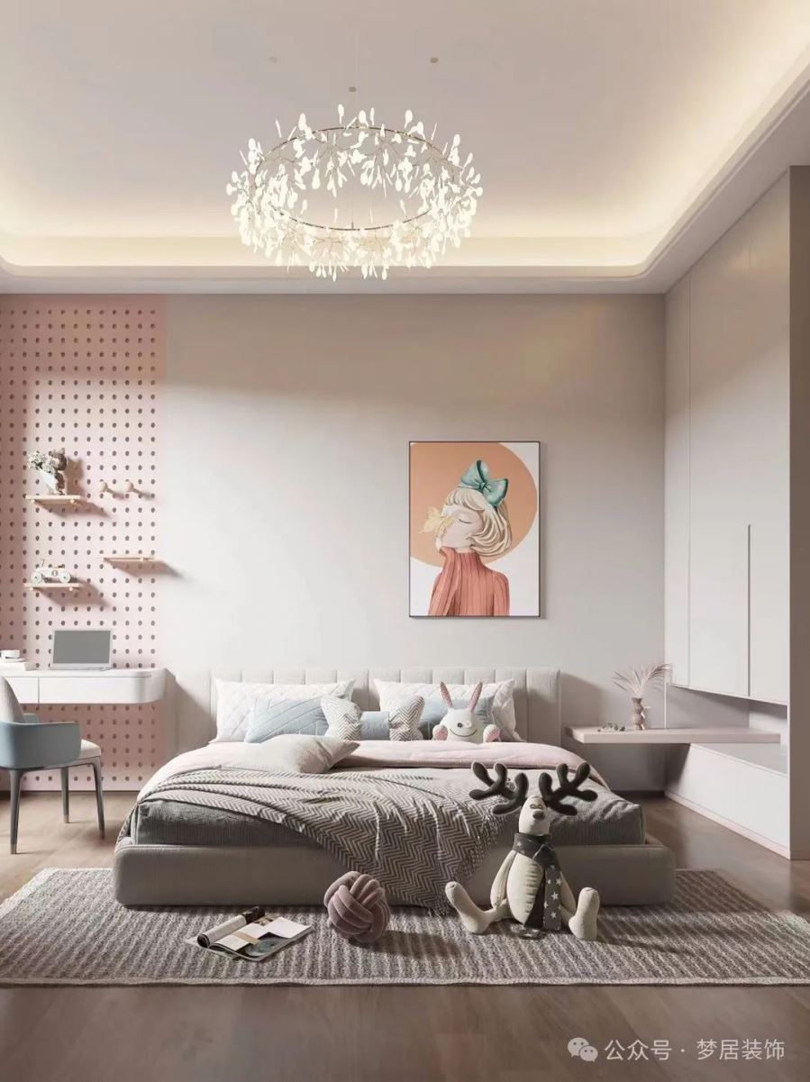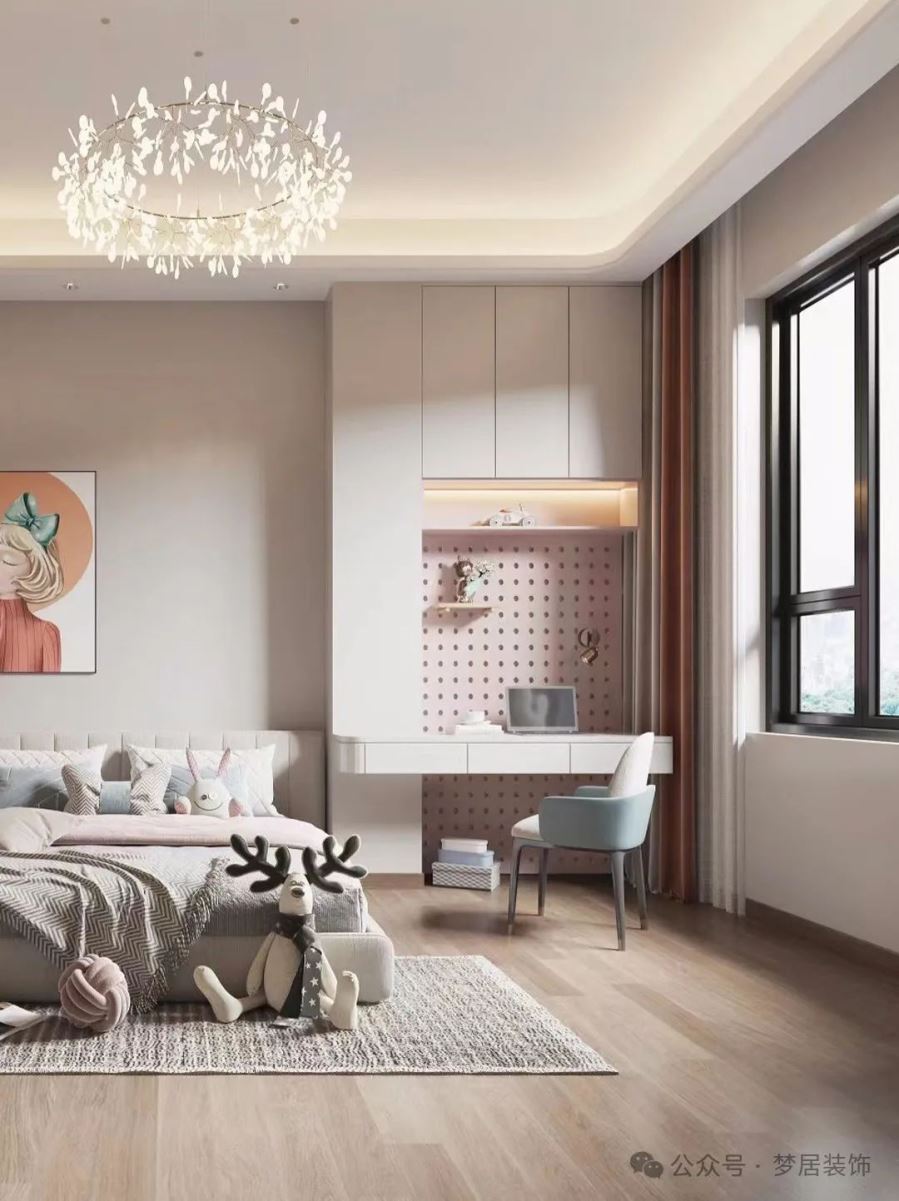 兒童房的規(guī)劃充分考慮了孩子的日常生活和學習需求。配備寬敞的書桌和舒適的椅子,方便孩子進行學習和閱讀,設(shè)置洞洞板培養(yǎng)孩子的動手能力和創(chuàng)造力。添加一些氛圍燈為房間增添溫馨的氛圍,也確保孩子在學習和閱讀時有足夠的光線,為孩子提供一個健康、舒適的成長環(huán)境。