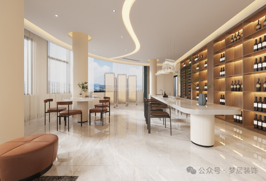 設(shè)計師將空間機能區(qū)域線條簡化,放大空間的高級優(yōu)雅質(zhì)感。配備品茗區(qū)、品酒區(qū),整面定制酒柜豐富墻面線條。天花做無主燈設(shè)計,流暢的燈光造型線條搭配現(xiàn)代水晶吊燈,在空間營造出動態(tài)之美。