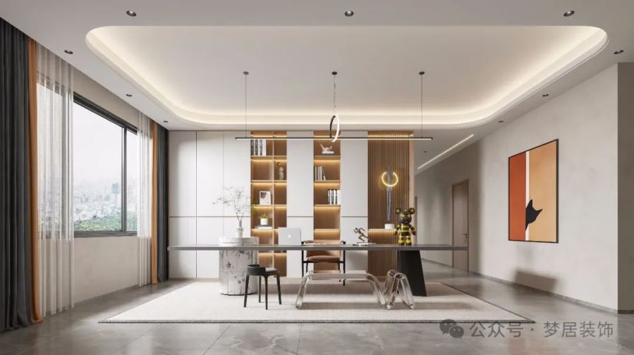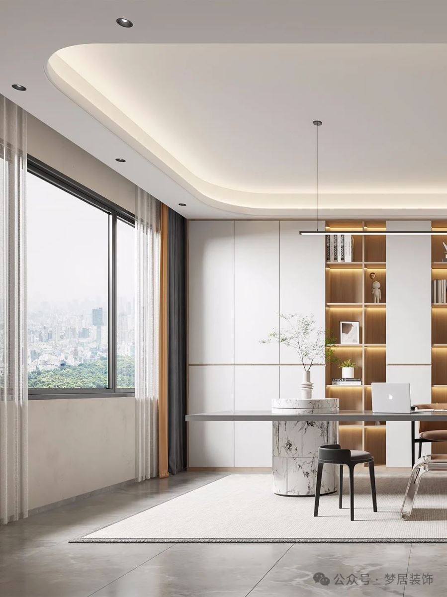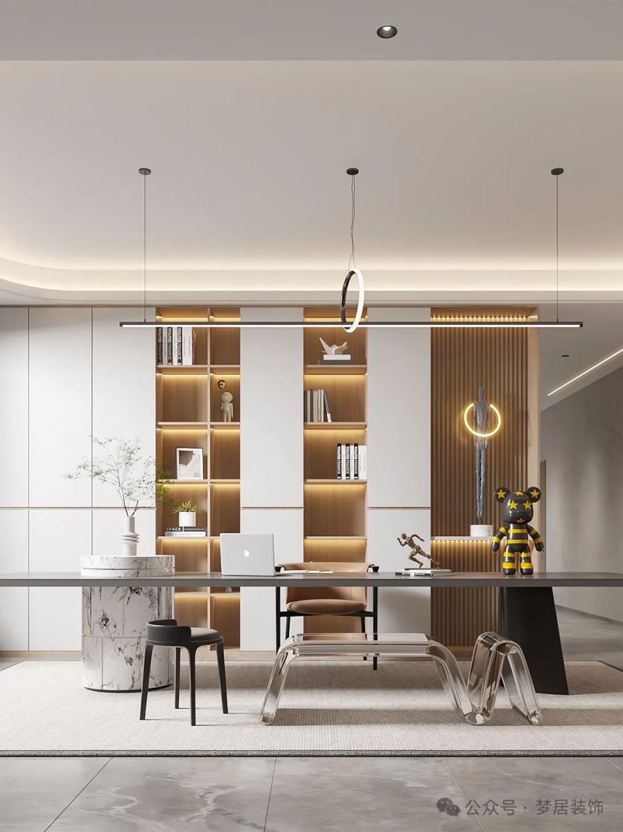 書房采用開放式設(shè)計,將書房與其他空間相互融合。大面積的窗戶引入自然光的同時補充人工照明,柔和的燈光營造出放松舒適的氛圍。挑選較為時尚款式的家具,放置電腦、書籍和其他辦公用品,添加業(yè)主喜歡的個性化裝飾元素,空間大方美觀又實用。