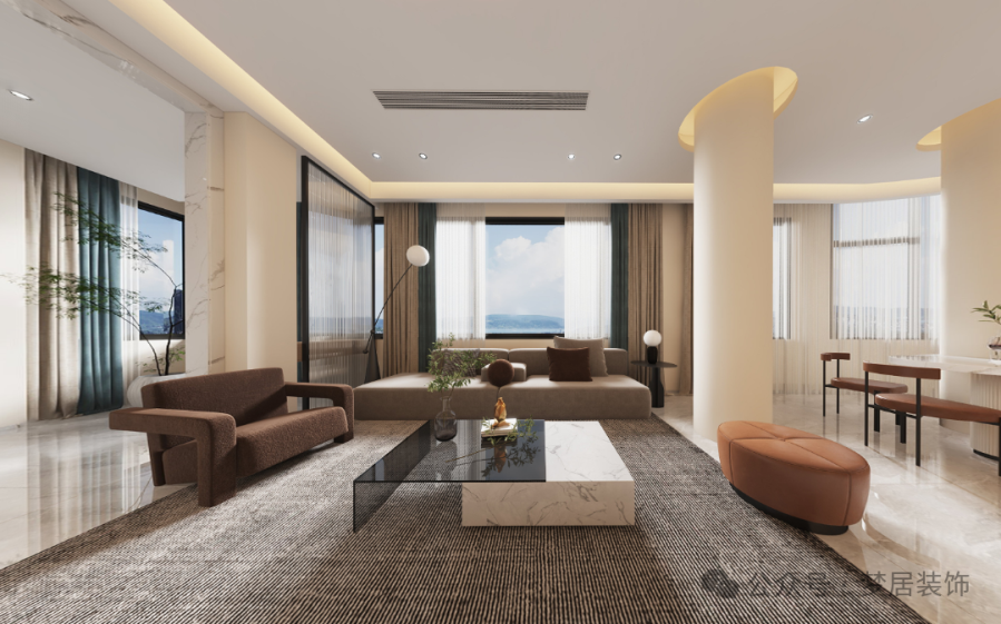 生活客廳追求舒適、簡約。客廳、餐廳和廚房區(qū)域相互銜接,合理的分區(qū)和布局使空間形成一個流暢的整體。中性色調(diào)作為整體配色營造出寧靜、舒適的氛圍。