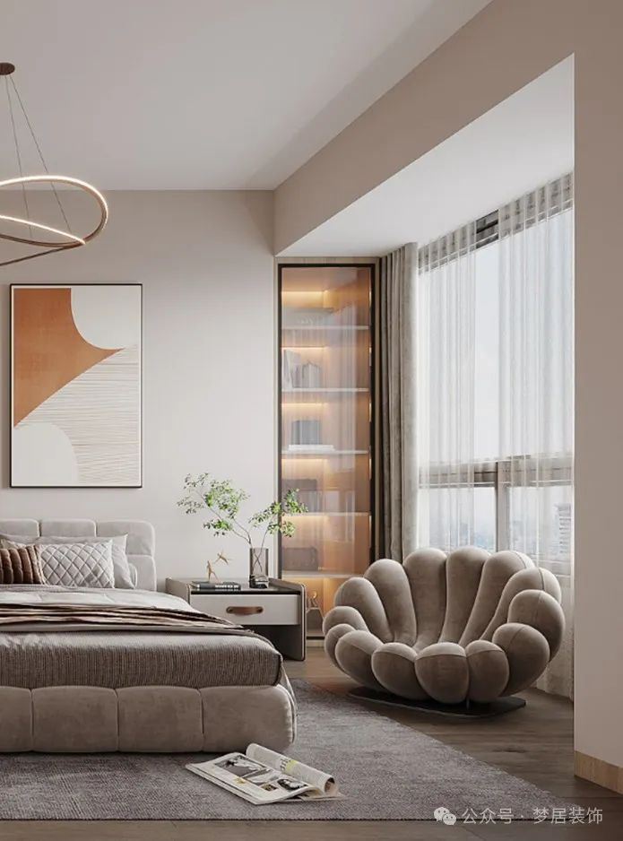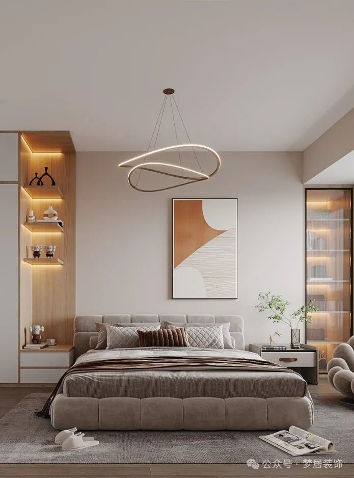 淺亞麻和木色的搭配,空間的溫馨在材質細節(jié)肌理中體現(xiàn),在氤氳的燈光中,生活的愉悅感受一一浮現(xiàn)。生活的松弛感透過材料的豐富表達拼湊出愜意的場景,讓隨心而至的慢調生活,進入愜意舒適的人生。