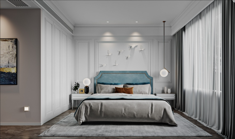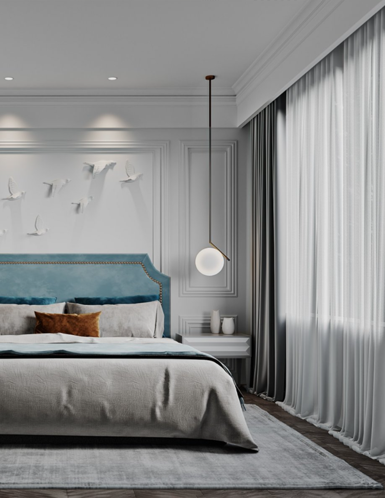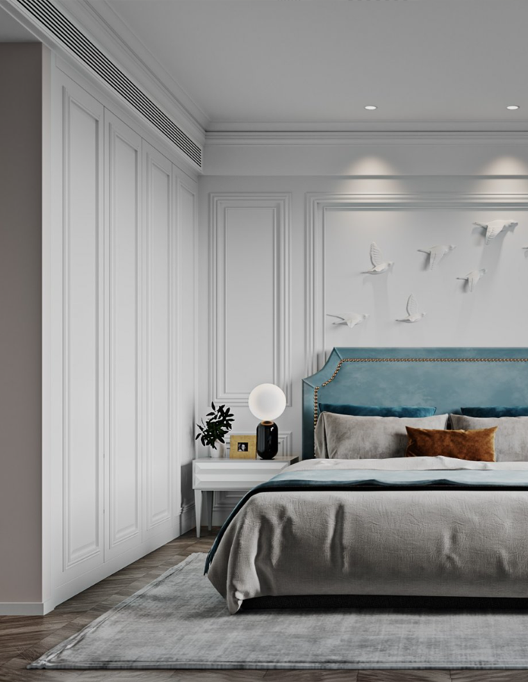 女兒房在裝飾上相對更加繁復(fù),精致的石膏線搭配軟裝帶來優(yōu)雅的復(fù)古質(zhì)感。床頭背景墻也用石膏雕刻出飛翔的鳥兒,立體的質(zhì)感讓空間靈動自然,簡約時尚的小燈飾也讓空間更加清新活潑,還增添了舒適和愜意的氛圍,為孩子營造了一個溫馨愉悅的空間。
