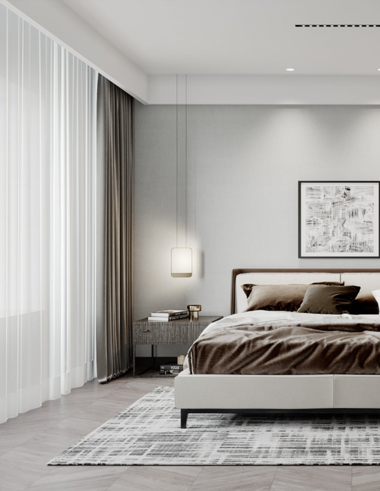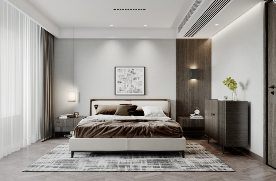 造型簡約的家具搭配,低調(diào)中彰顯著輕奢的優(yōu)雅氣質(zhì);和諧的色彩搭配帶來舒適的視覺體驗(yàn);無主燈設(shè)計則為空間增添了現(xiàn)代感和時尚感。