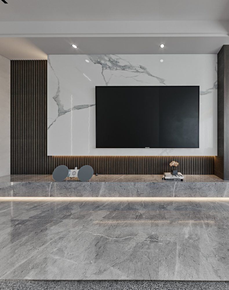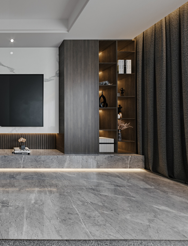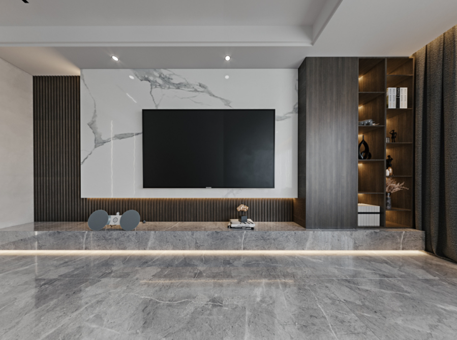 電視背景墻選用淺色巖板搭配深色木格柵,豐富了空間立體感。大理石地臺內(nèi)嵌隱藏?zé)魩В纬蓱腋〉男Ч?,營造氛圍感。側(cè)邊定制了一組儲物裝飾柜,整體設(shè)計考慮到了實(shí)用性和美觀性,讓空間更具品味和舒適感。
