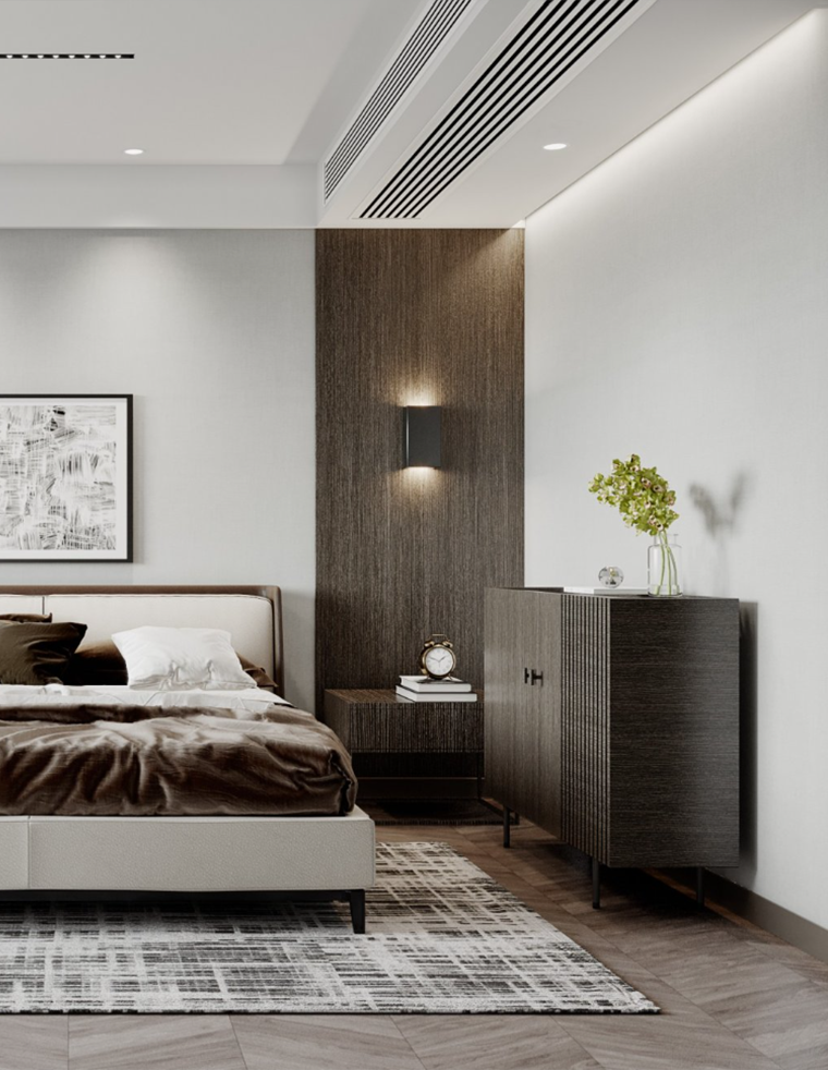 主臥延續(xù)簡約自然的格調(diào),床頭背景墻選用墻布+木飾面拼接,加上燈具的點(diǎn)綴,整體更顯精致優(yōu)雅,層次更加分明。當(dāng)夜幕降臨,柔和的燈光讓人感到舒適和放松,臥室營造出溫馨迷人的氛圍。小小的側(cè)邊柜與深色木飾面相呼應(yīng),經(jīng)典又優(yōu)雅。