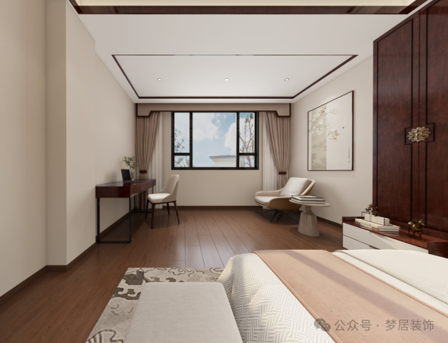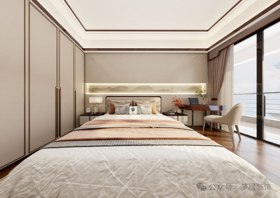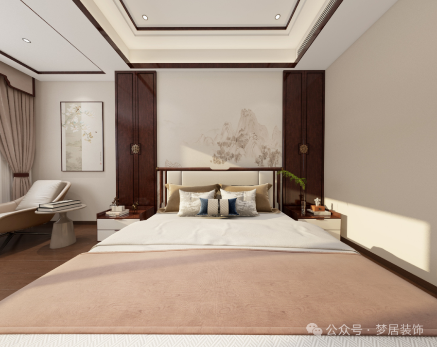 次臥空間設(shè)計(jì)延續(xù)舒適優(yōu)雅的感受,床頭背景墻的水墨光影和燈光設(shè)計(jì)增加了空間中式意境,將中式意韻的靈動(dòng)雅韻充分演繹。