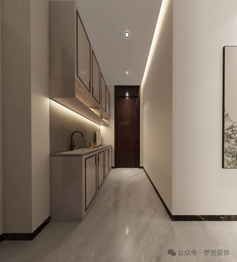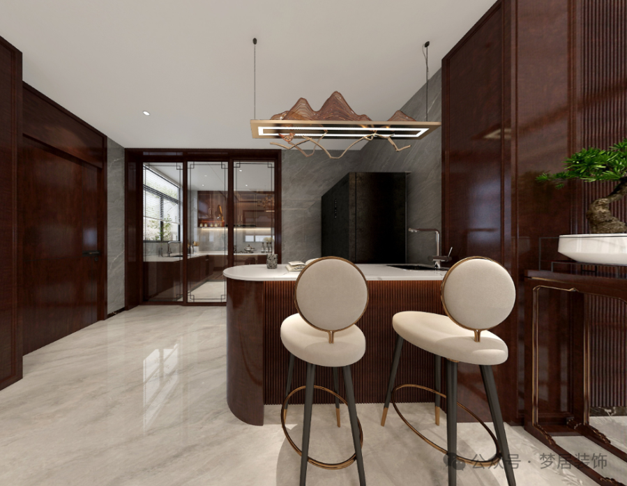 餐廳旁設(shè)置了吧臺(tái),吧臺(tái)的設(shè)計(jì)融合了傳統(tǒng)中式元素和現(xiàn)代設(shè)計(jì)理念,創(chuàng)造出既有傳統(tǒng)韻味又不失現(xiàn)代感的空間體驗(yàn)。