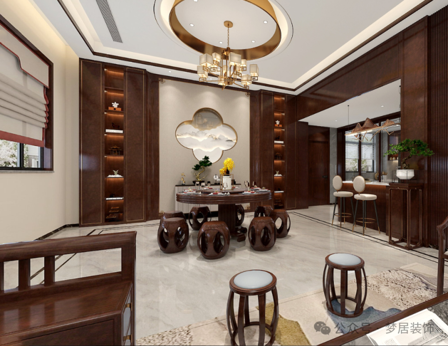 三餐四季,家人圍坐,燈火可親。餐廳選用圓形吊頂設(shè)計(jì),搭配經(jīng)典的中式圓桌,代表著天地人和;背景墻的中式梅花造型,寓意喜樂、吉祥。