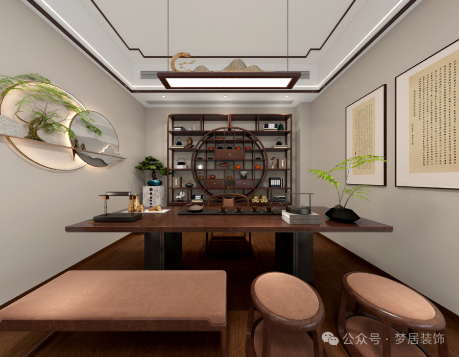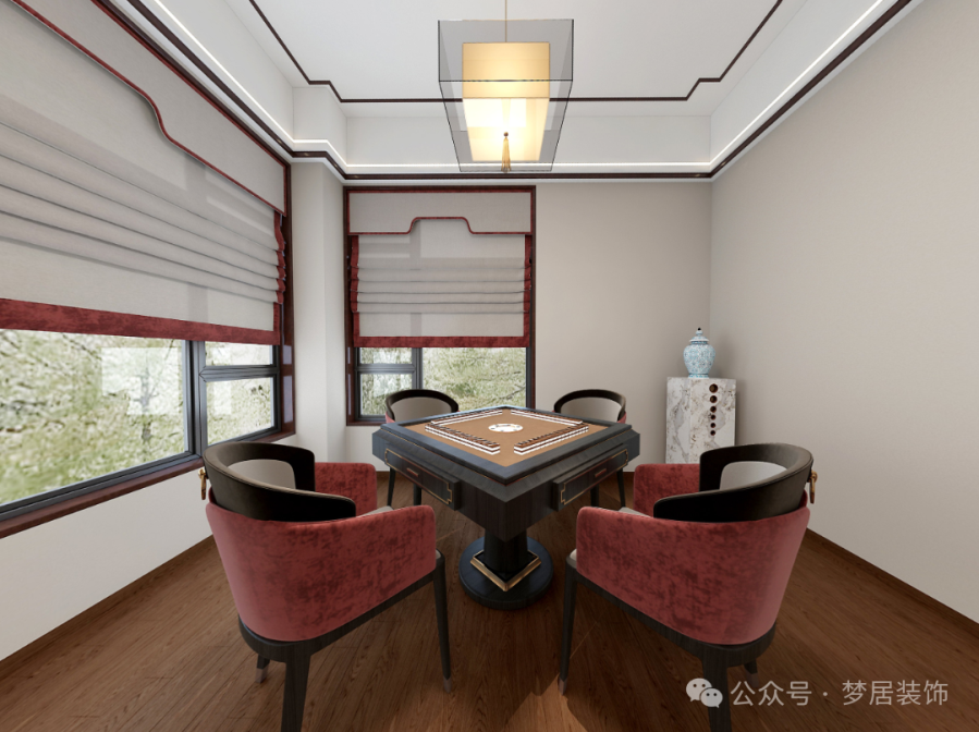 茶室天然的木作自然和諧地搭配在一起,塑造出豐富充盈的新中式空間美感。設(shè)置了麻將桌,滿足家庭娛樂時(shí)光。