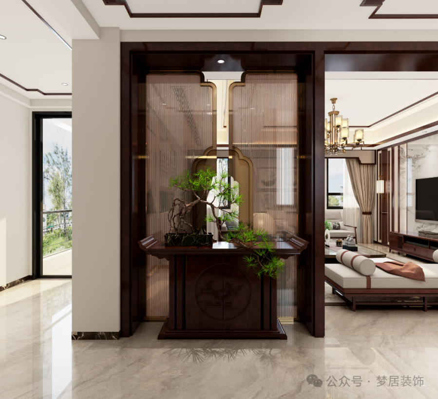 二樓玄關(guān)的端景設(shè)計(jì)讓藝術(shù)形式與生活交融,將經(jīng)典設(shè)計(jì)精神引入空間設(shè)計(jì),從而凸顯不凡的品質(zhì)。中式的意韻,從多個(gè)維度予人以細(xì)膩的體驗(yàn)。