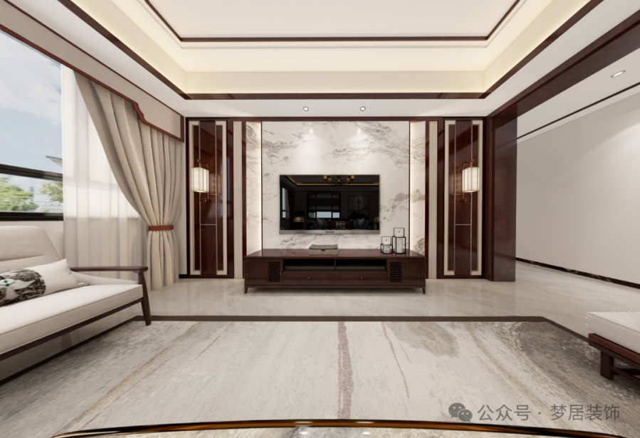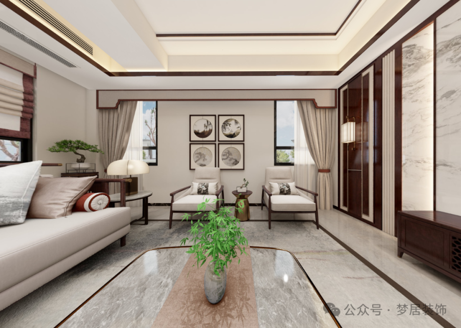 新中式客廳為對(duì)稱式布局,高闊寬敞,典雅大氣,選用造型簡樸優(yōu)美的中式家具,格調(diào)高雅。