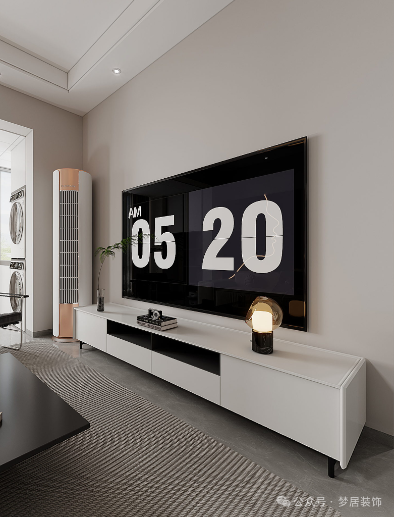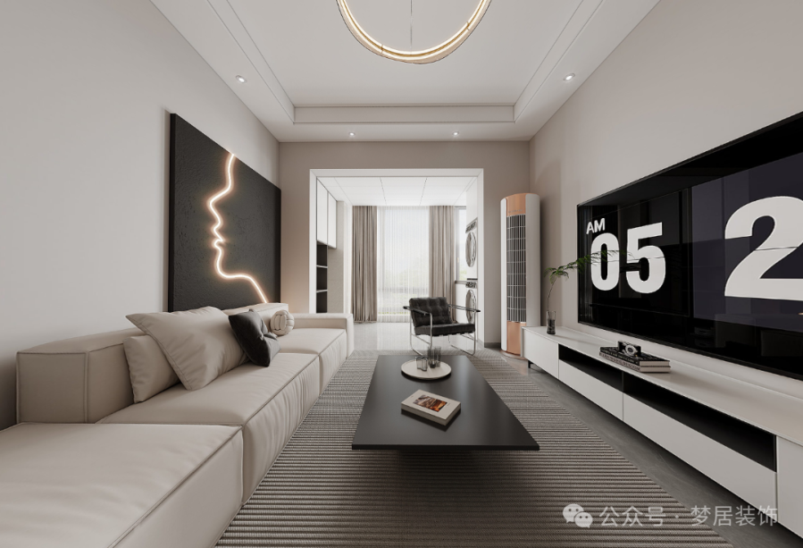 黑白配色,干凈純粹。黑色的電視搭配現(xiàn)代極簡(jiǎn)的電視柜,放置時(shí)尚氛圍燈和小綠植,為客廳打造出簡(jiǎn)練時(shí)尚氛圍。