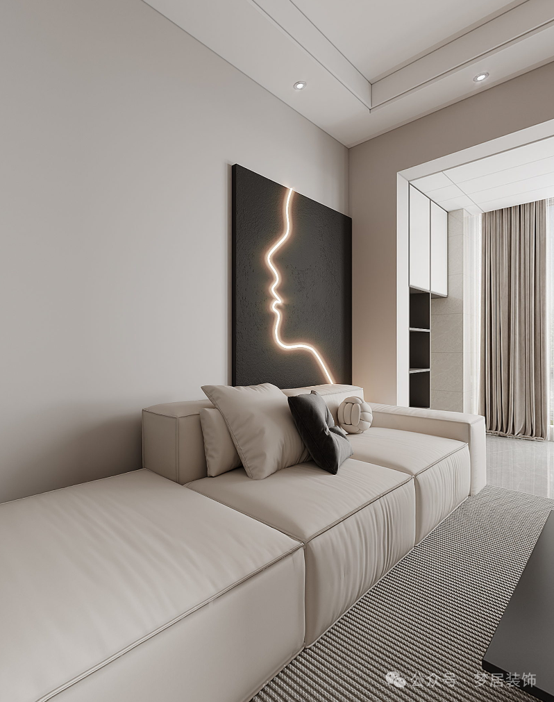 柔軟的布藝沙發(fā)舒適度滿(mǎn)分,極簡(jiǎn)留白的墻面搭配現(xiàn)代藝術(shù)畫(huà)作,一切看上去簡(jiǎn)約隨性,但所顯露的高級(jí)感怎么也看不膩。