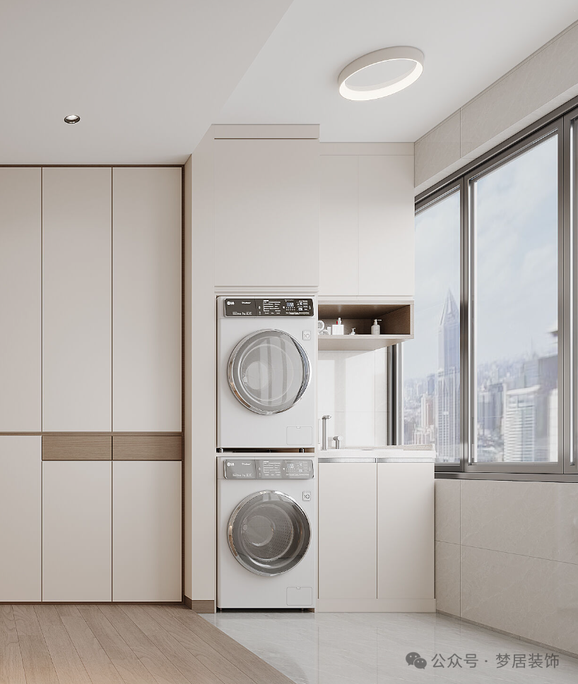 ⑤洗衣陽(yáng)臺(tái):設(shè)計(jì)家務(wù)陽(yáng)臺(tái),在陽(yáng)臺(tái)的一側(cè)加建家務(wù)儲(chǔ)物柜,收納平時(shí)用的生活用品,另一側(cè)設(shè)置洗衣區(qū),配置洗衣套裝,滿足日常的洗衣需求。