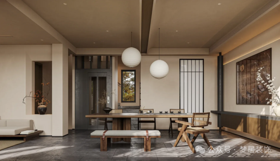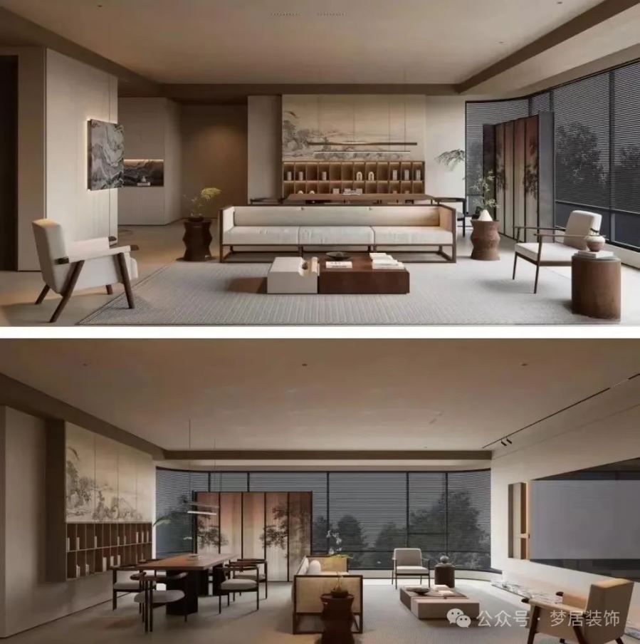 將山水理想寄情于庭院屋舍當(dāng)中,舍中有景,景中有舍。山水風(fēng)景、人文理想微縮于現(xiàn)代室內(nèi)空間,承載國人的山水情思寄托。