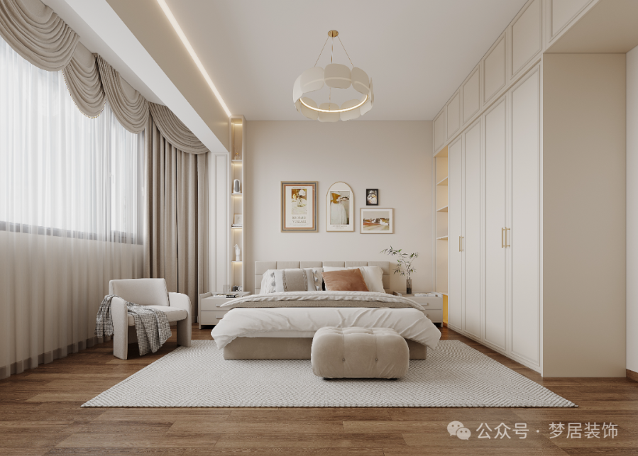 奶白色的床品與全屋調性完美契合,搭配木地板透著無限溫暖,木質和奶白色的和諧搭配,共同營造出寧靜而愜意的休憩氛圍,給業(yè)主高品質的松弛自在。