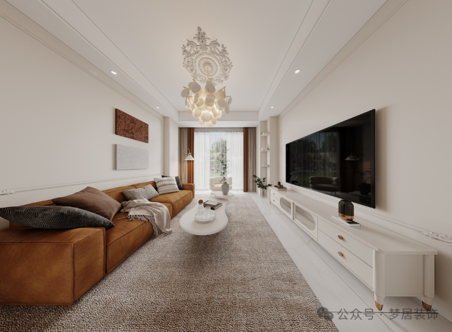 唯美浪漫的貝母吊燈搭配吊頂法式雕花燈座,陽光穿過窗簾,灑落在客廳,為客廳添上一層溫暖濾鏡,光影交互,精致溫馨,散發(fā)出法式奶油的馥郁芬芳。