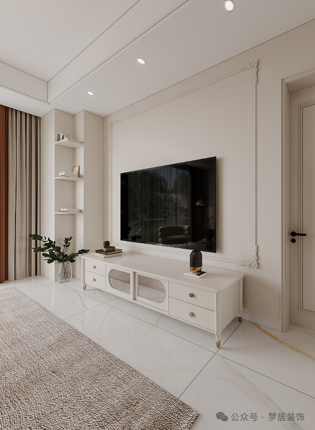 客廳電視背景墻搭配法式PU線條、雕花使整個空間調性更加柔和,視覺上也更立體、更有層次。