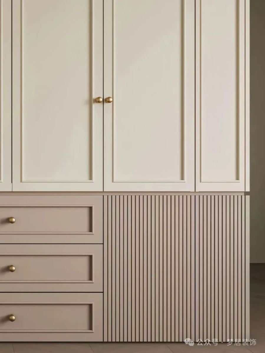 喜歡拼色的可以少量選擇莫蘭迪色系的淺灰綠、臟粉、少女粉等進(jìn)行拼接,柜門用金色質(zhì)感圓潤的拉手來提升精致感。